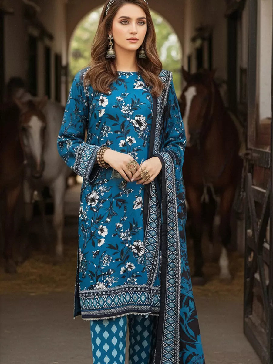 Elegant 3-piece khaddar suit featuring a beautifully printed khaddar shirt, printed khaddar dupatta, and a coordinated printed trouser. Crafted from soft winter khaddar fabric, this outfit combines comfort with timeless floral charm, perfect for everyday elegance and seasonal style.