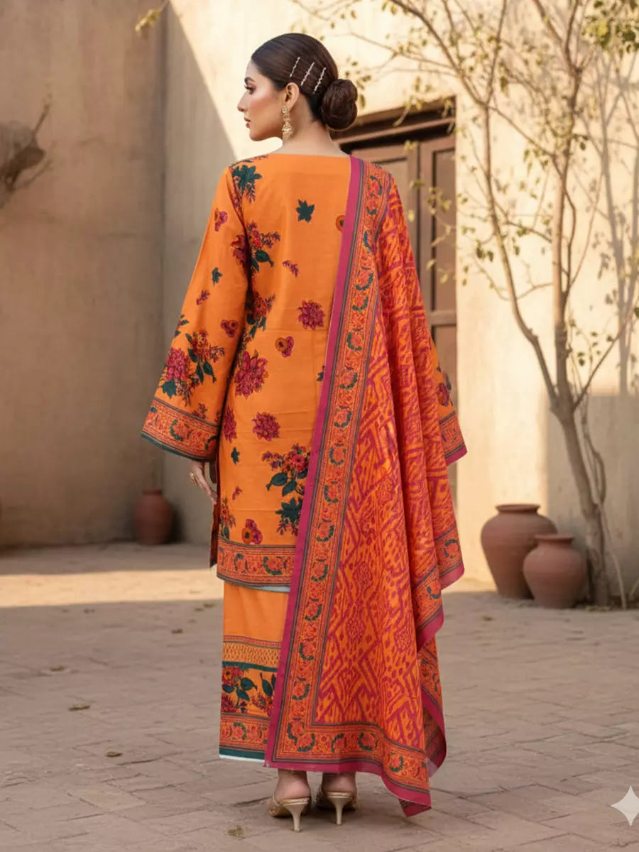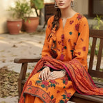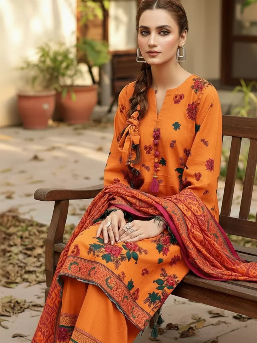 Elegant 3-piece khaddar suit featuring a beautifully printed khaddar shirt, printed khaddar dupatta, and a coordinated printed trouser. Crafted from soft winter khaddar fabric, this outfit combines comfort with timeless floral charm, perfect for everyday elegance and seasonal style.