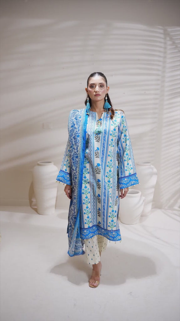 Elegant 3-piece suit in premium printed lawn silk. Includes a breathable shirt, trousers, and a lightweight dupatta. Perfect for any occasion.