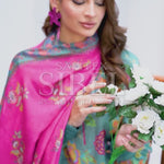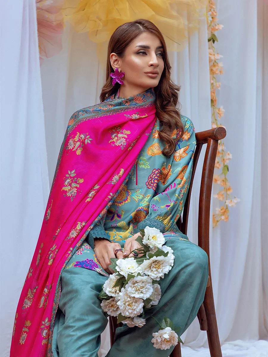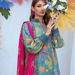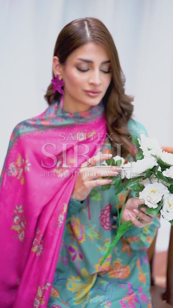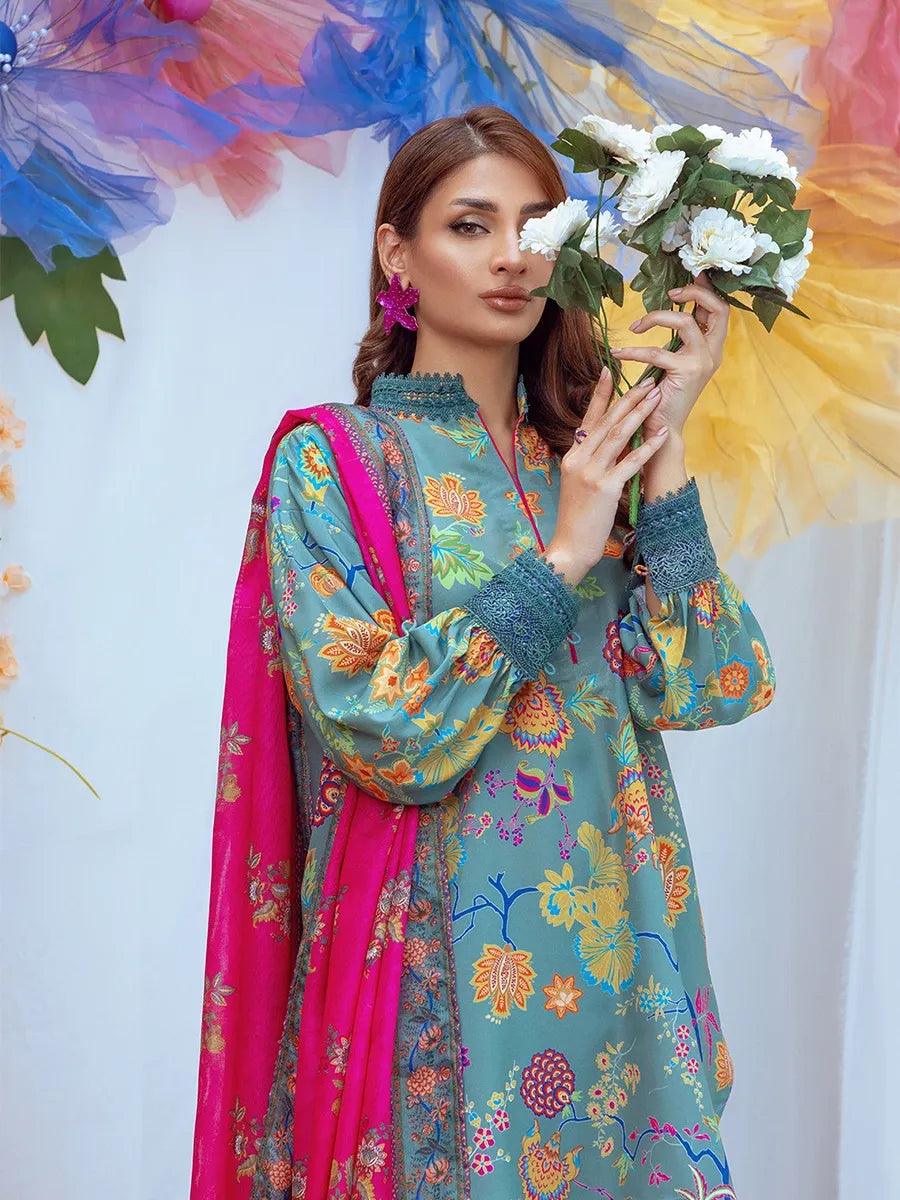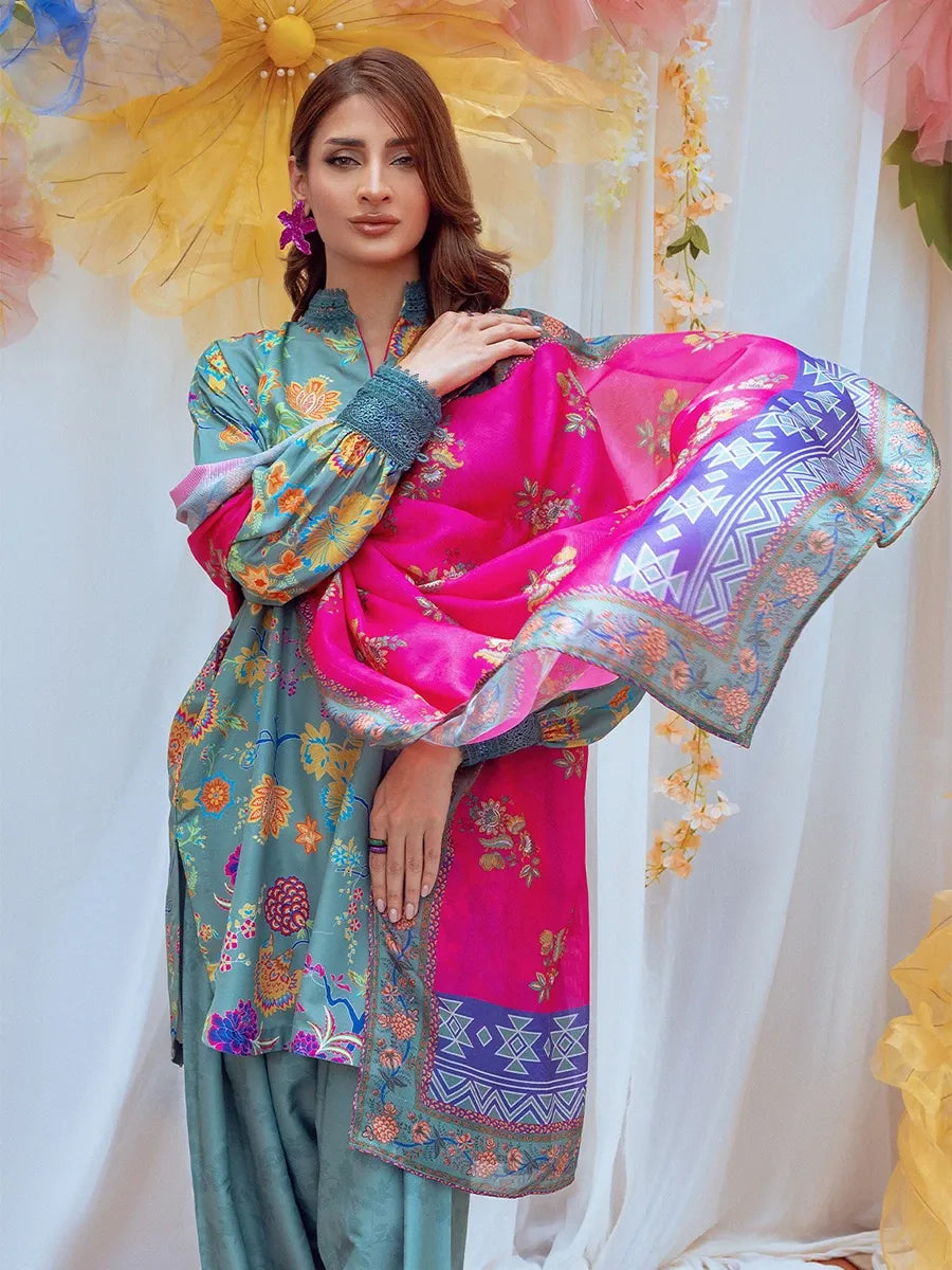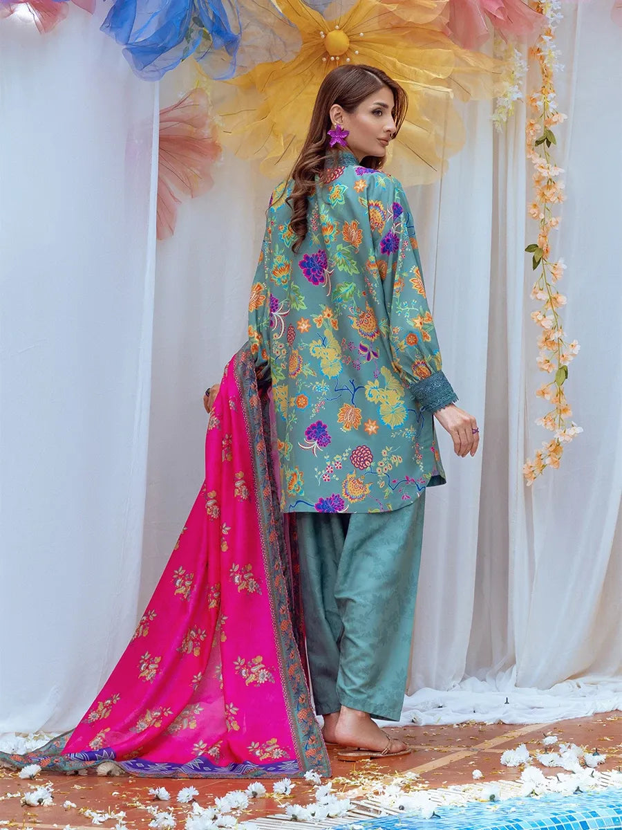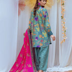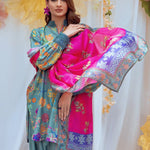 Embrace elegance in our stunning green and pink 3-piece ensemble, featuring a printed lawn silk shirt and a delicate printed net dupatta – a true masterpiece of style