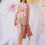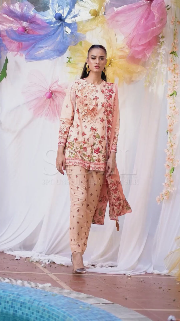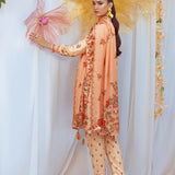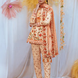 Step into sophistication with our stunning peach-printed 3-piece, featuring a beautifully designed lawn silk shirt and a matching printed net dupatta – a perfect balance of grace and style