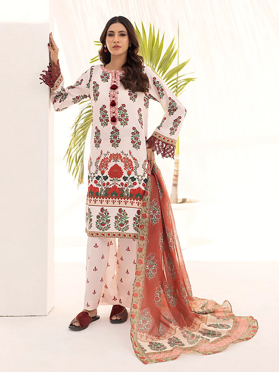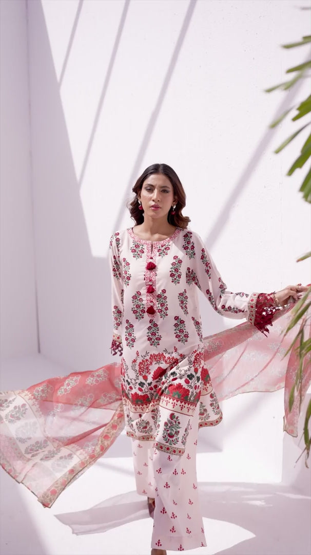 Elegant 3-piece suit in premium printed lawn silk. Includes a breathable shirt, matching trousers, and lightweight dupatta. Perfect for any occasion