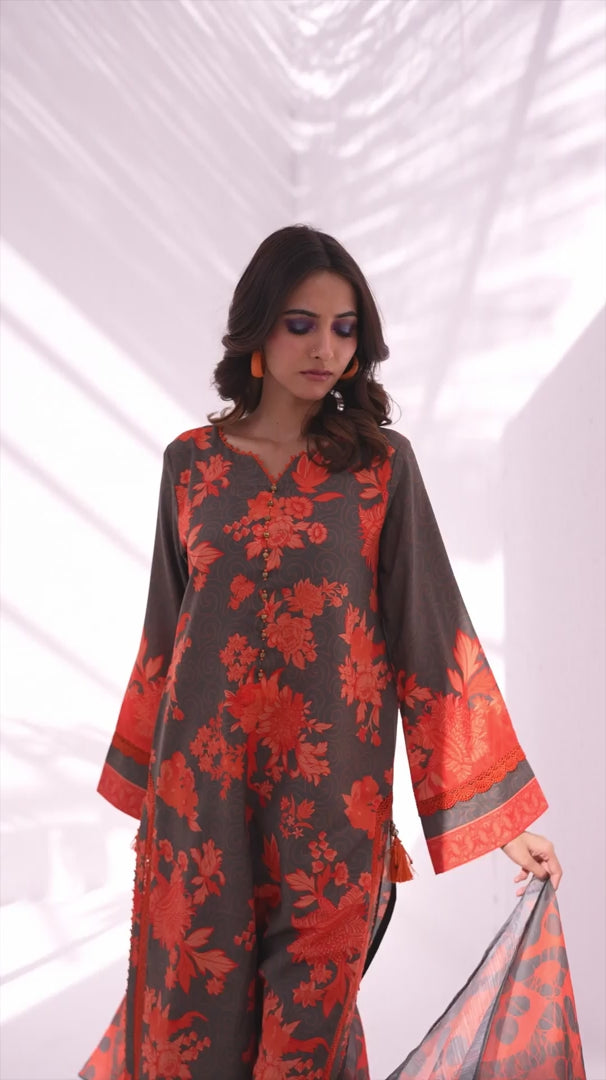 Elegant 3-piece suit in premium printed lawn silk. Includes a breathable shirt, matching trousers, and lightweight dupatta. Perfect for any occasion
