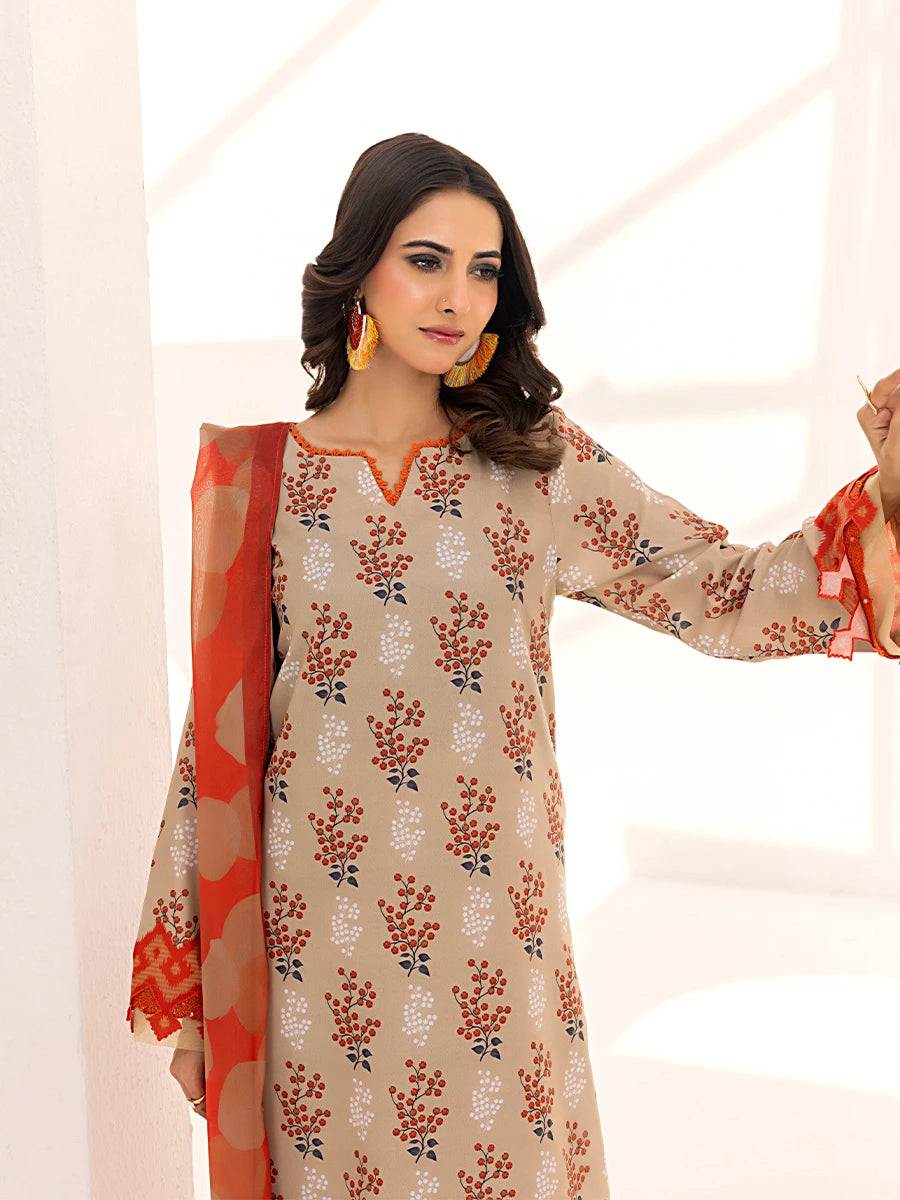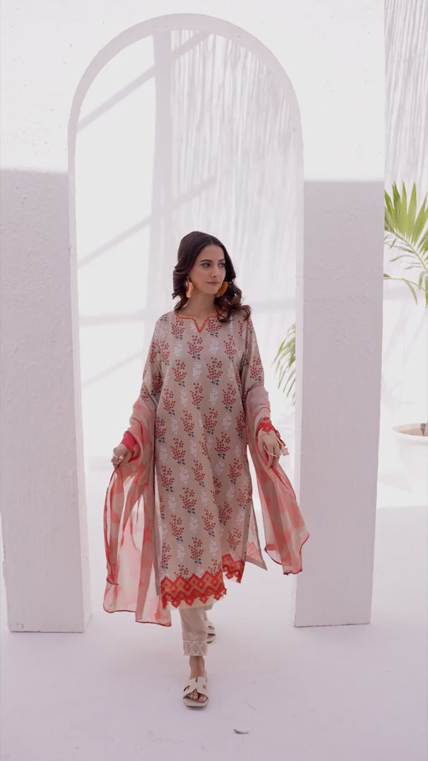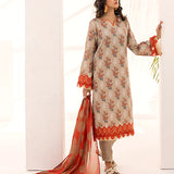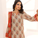 Elegant 3-piece suit in premium printed lawn silk. Includes a breathable shirt, matching trousers, and lightweight dupatta. Perfect for any occasion