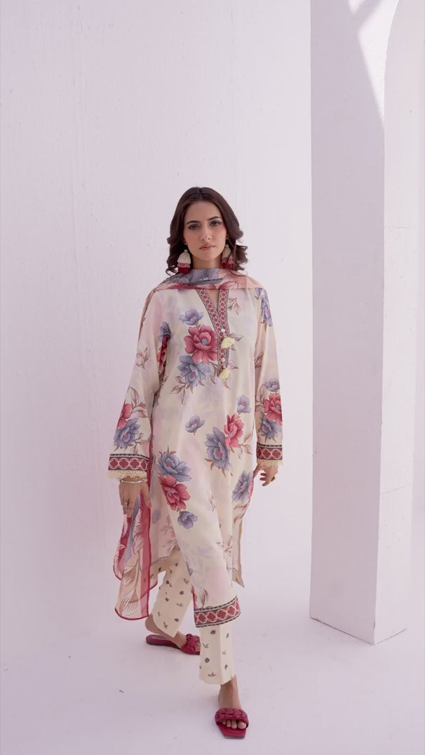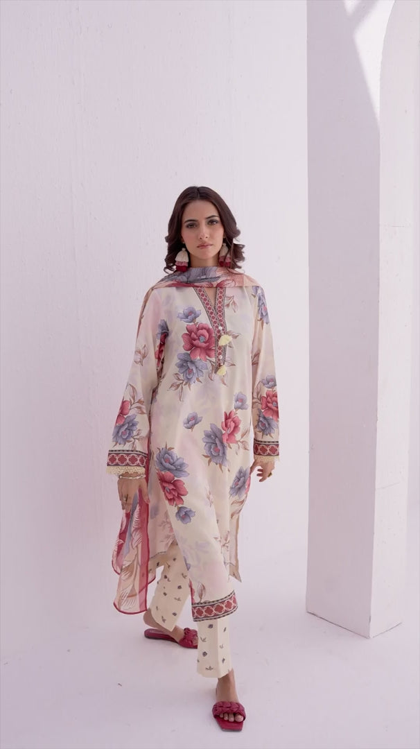 Elegant 3-piece suit in premium printed lawn silk. Includes a breathable shirt, matching trousers, and lightweight dupatta. Perfect for any occasion