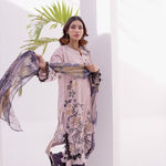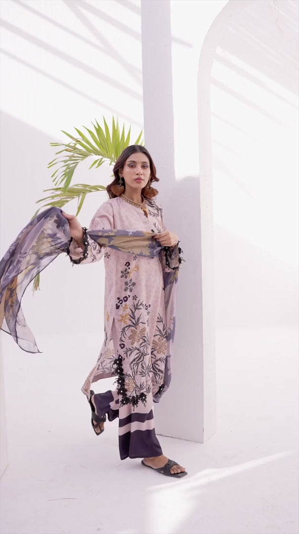 Elegant 3-piece suit in premium printed lawn silk. Includes a breathable shirt, matching trousers, and lightweight dupatta. Perfect for any occasion
