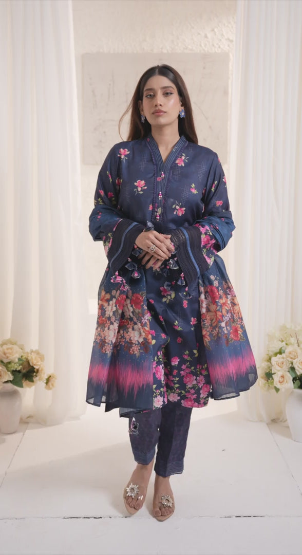 Elegant 3-piece suit in premium printed lawn silk. Includes a breathable shirt, trousers, and a lightweight dupatta. Perfect for any occasion.