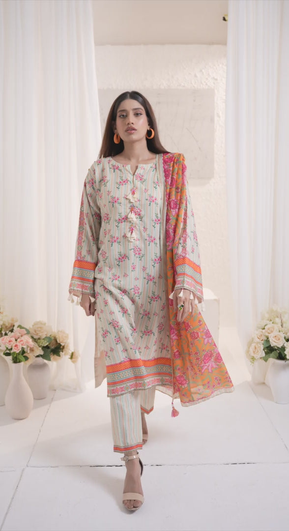 Elegant 3-piece suit in premium printed lawn silk. Includes a breathable shirt, trousers, and a lightweight dupatta. Perfect for any occasion.