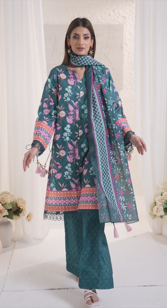Elegant 3-piece suit in premium printed lawn silk. Includes a breathable shirt, trousers, and a lightweight dupatta. Perfect for any occasion.
