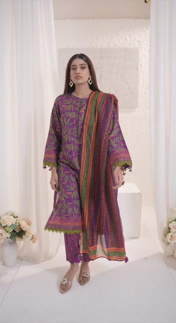 Elegant 3-piece suit in premium printed lawn silk. Includes a breathable shirt, trousers, and a lightweight dupatta. Perfect for any occasion.