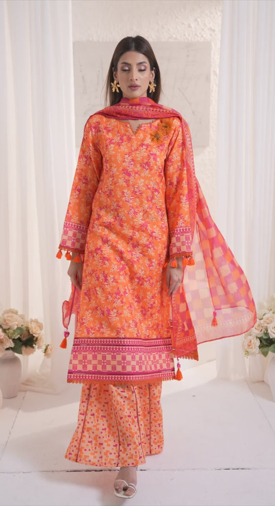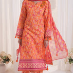 Elegant 3-piece suit in premium printed lawn silk. Includes a breathable shirt, trousers, and a lightweight dupatta. Perfect for any occasion.