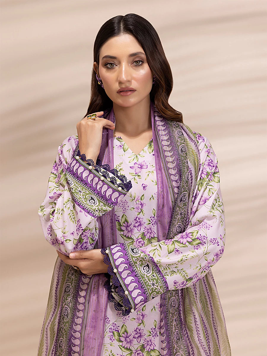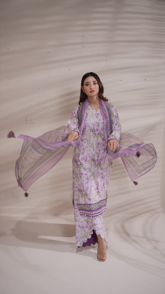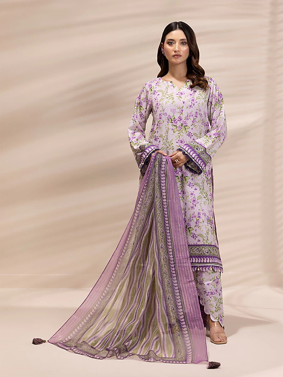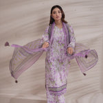 Elegant 3-piece suit in premium printed lawn silk. Includes a breathable shirt, trousers, and a lightweight dupatta. Perfect for any occasion.