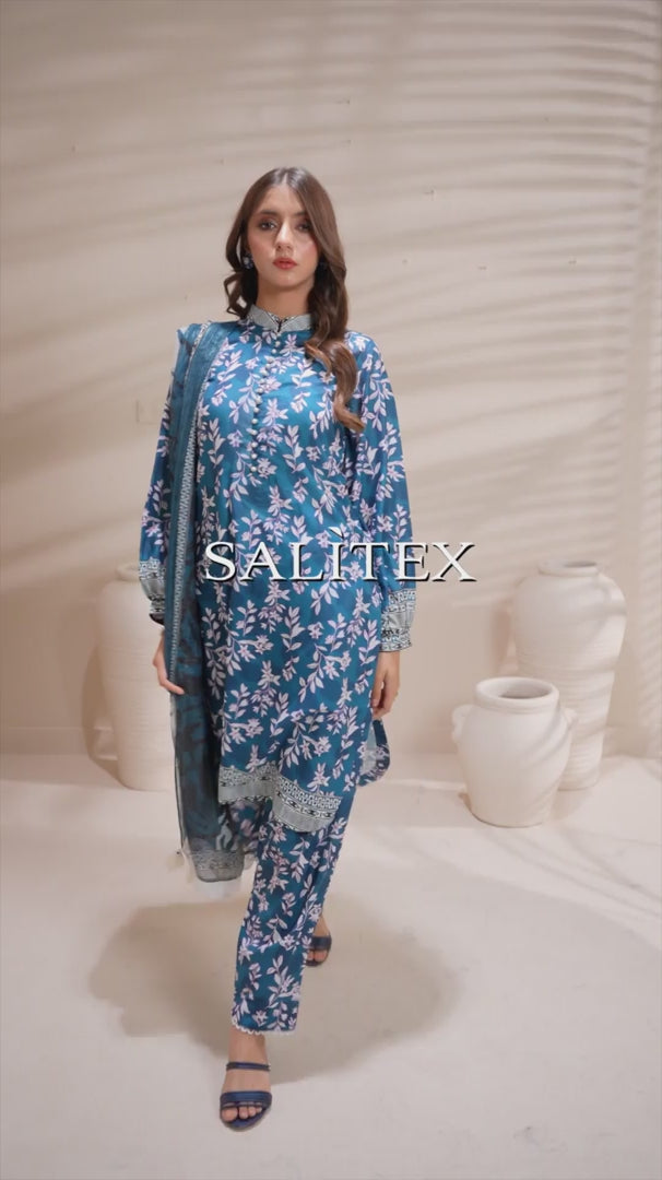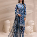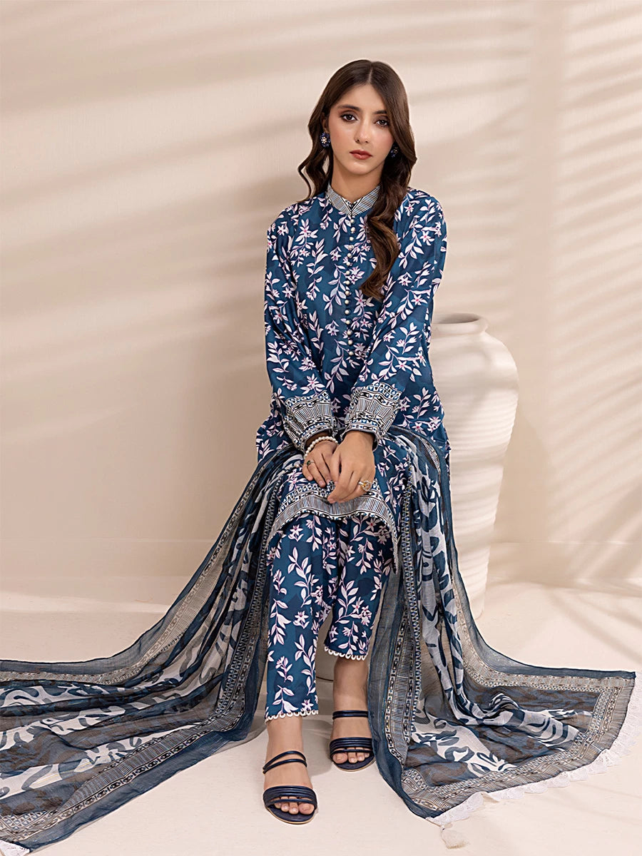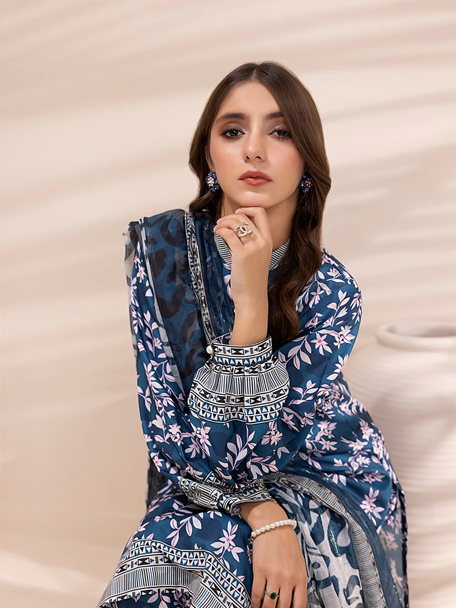 Elegant 3-piece suit in premium printed lawn silk. Includes a breathable shirt, trousers, and a lightweight dupatta. Perfect for any occasion.