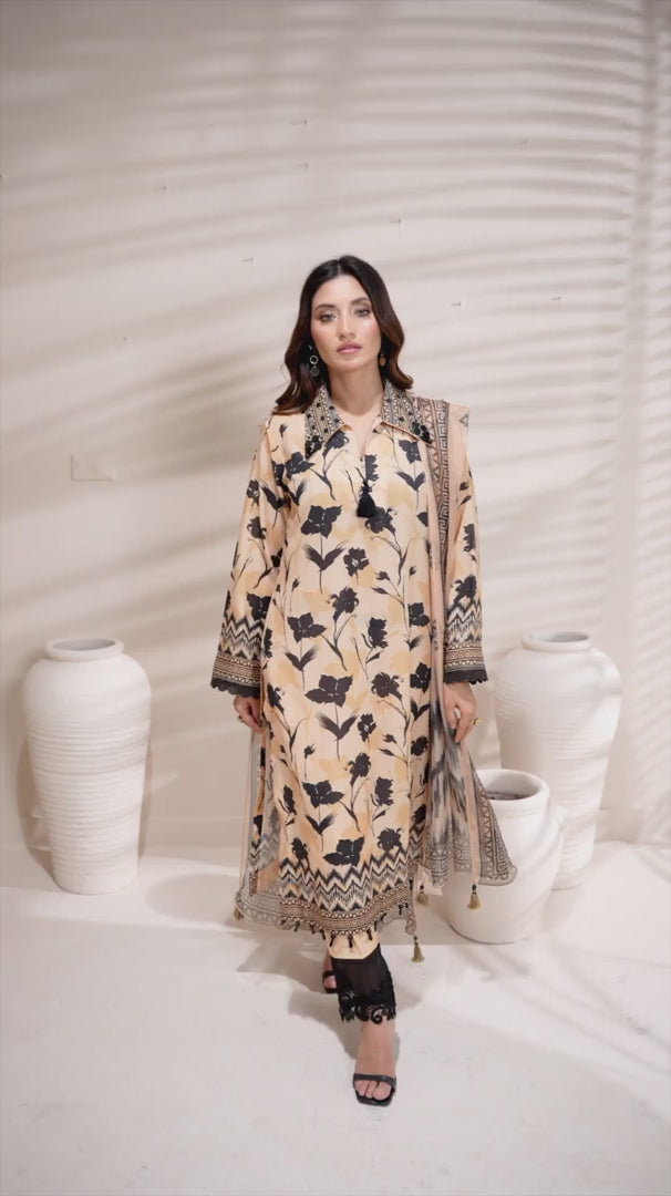 Elegant 3-piece suit in premium printed lawn silk. Includes a breathable shirt, trousers, and a lightweight dupatta. Perfect for any occasion.