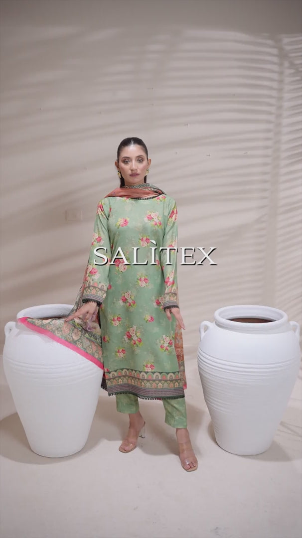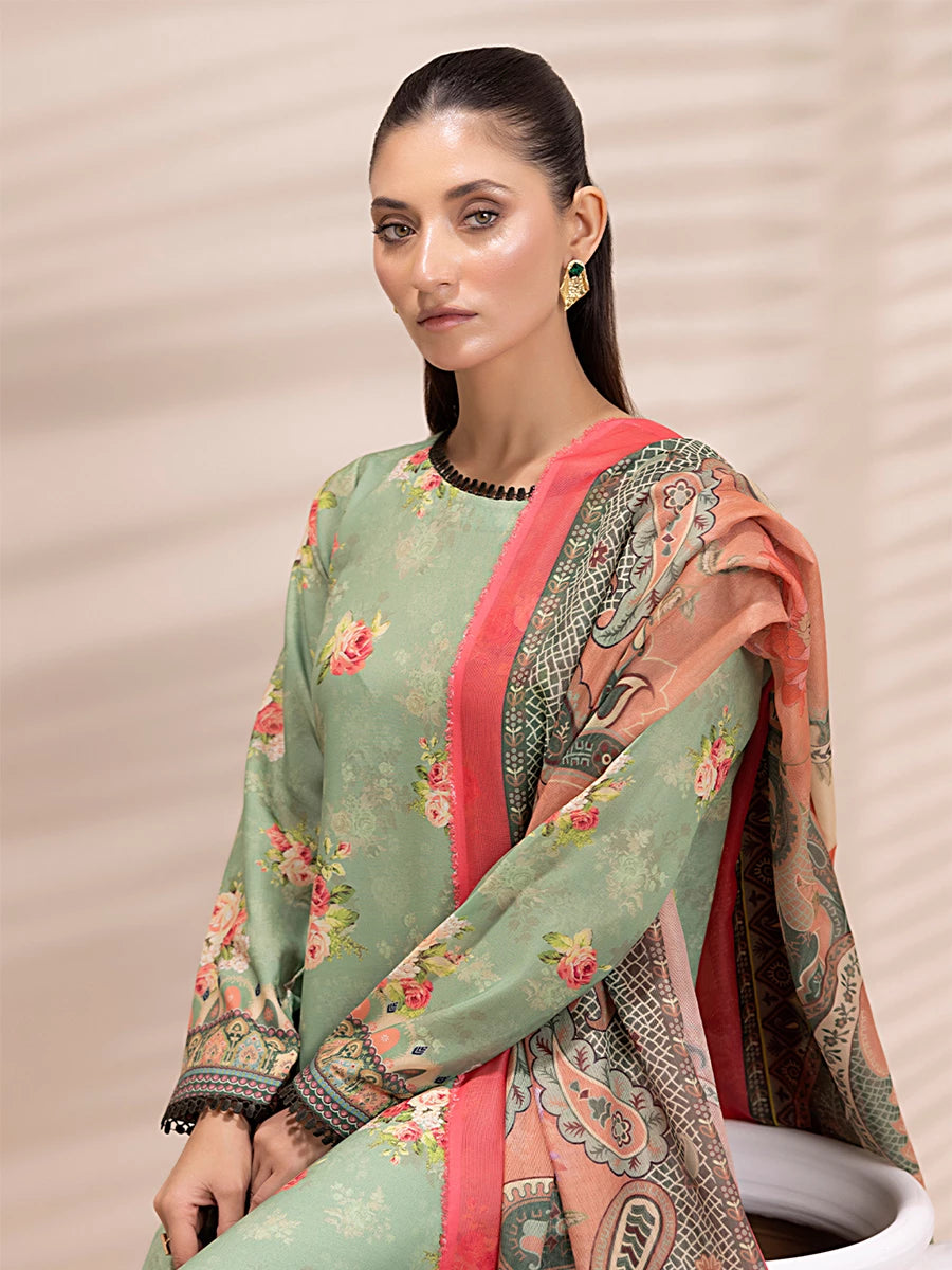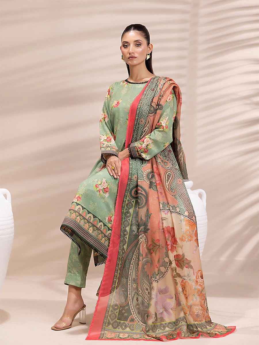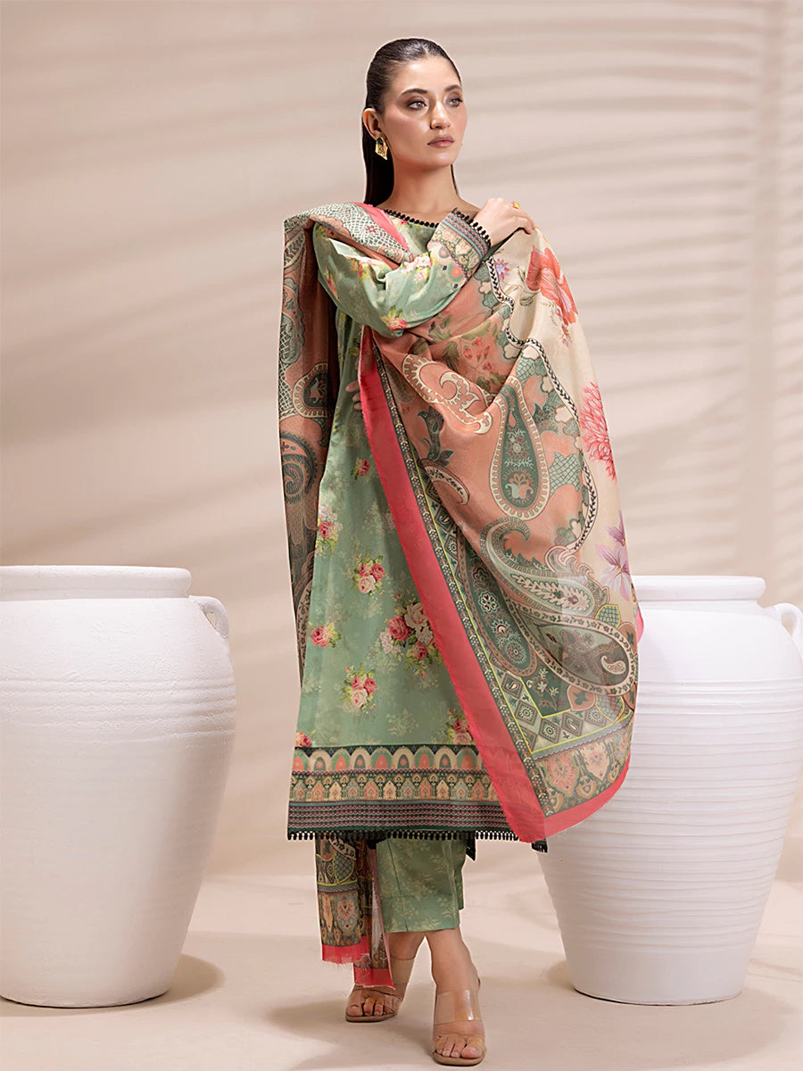 Elegant 3-piece suit in premium printed lawn silk. Includes a breathable shirt, trousers, and a lightweight dupatta. Perfect for any occasion.