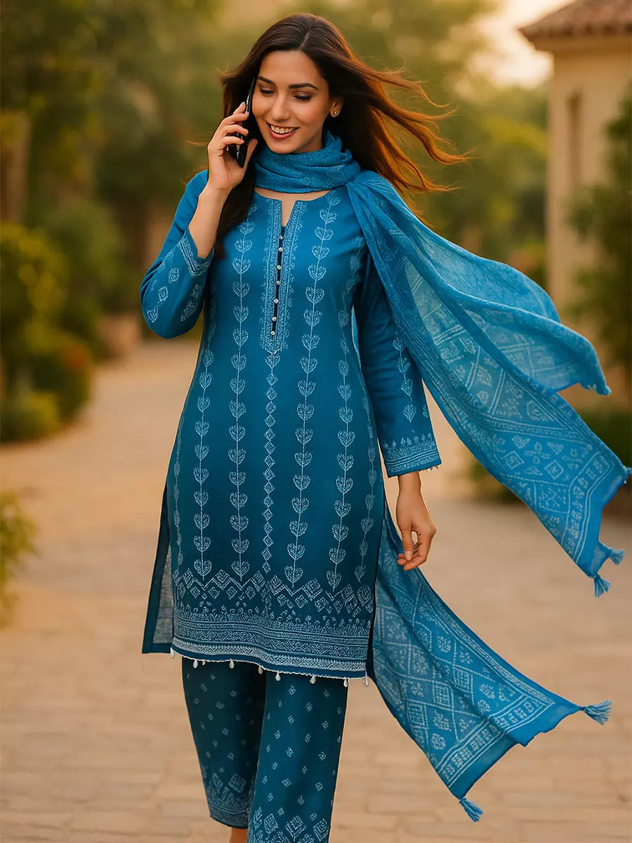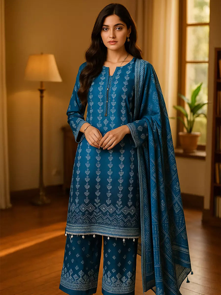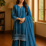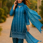 Elegant 3-piece suit in premium printed lawn silk. Includes a breathable shirt, trousers, and a lightweight dupatta. Perfect for any occasion.