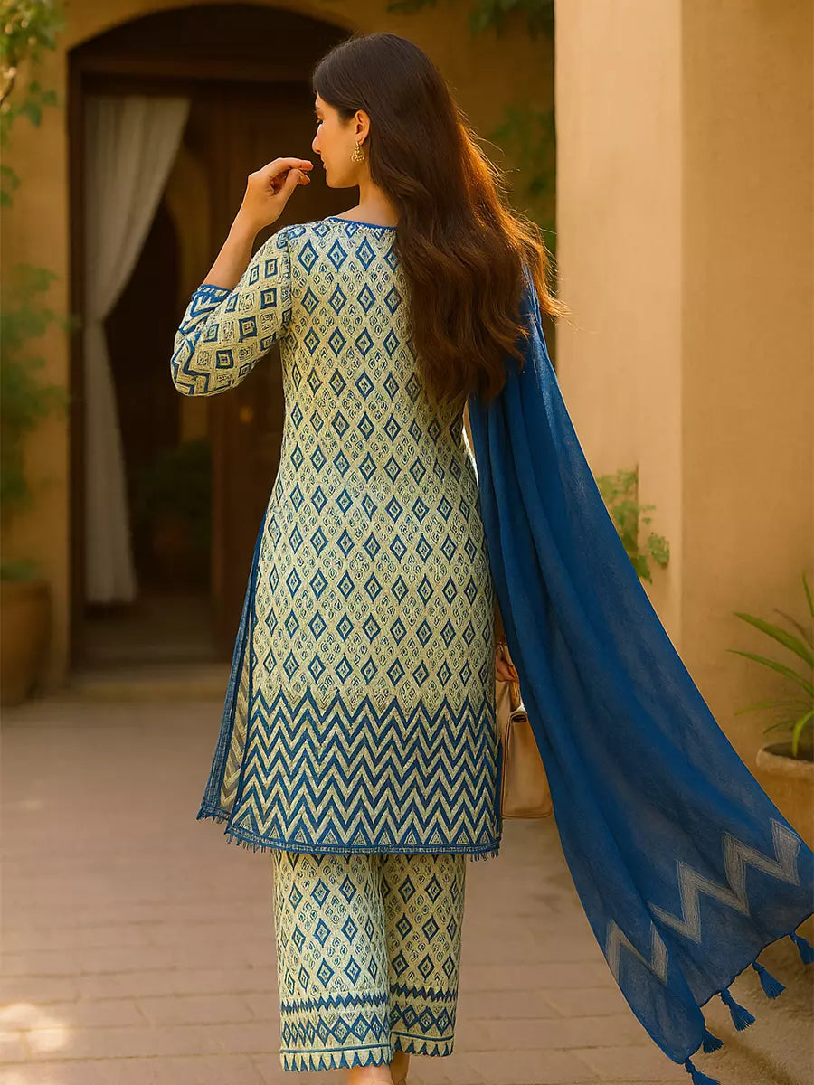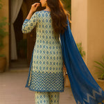 Elegant 3-piece suit in premium printed lawn silk. Includes a breathable shirt, trousers, and a lightweight dupatta. Perfect for any occasion.