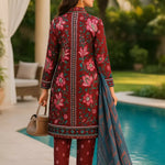 Elegant 3-piece suit in premium printed lawn silk. Includes a breathable shirt, trousers, and a lightweight dupatta. Perfect for any occasion.