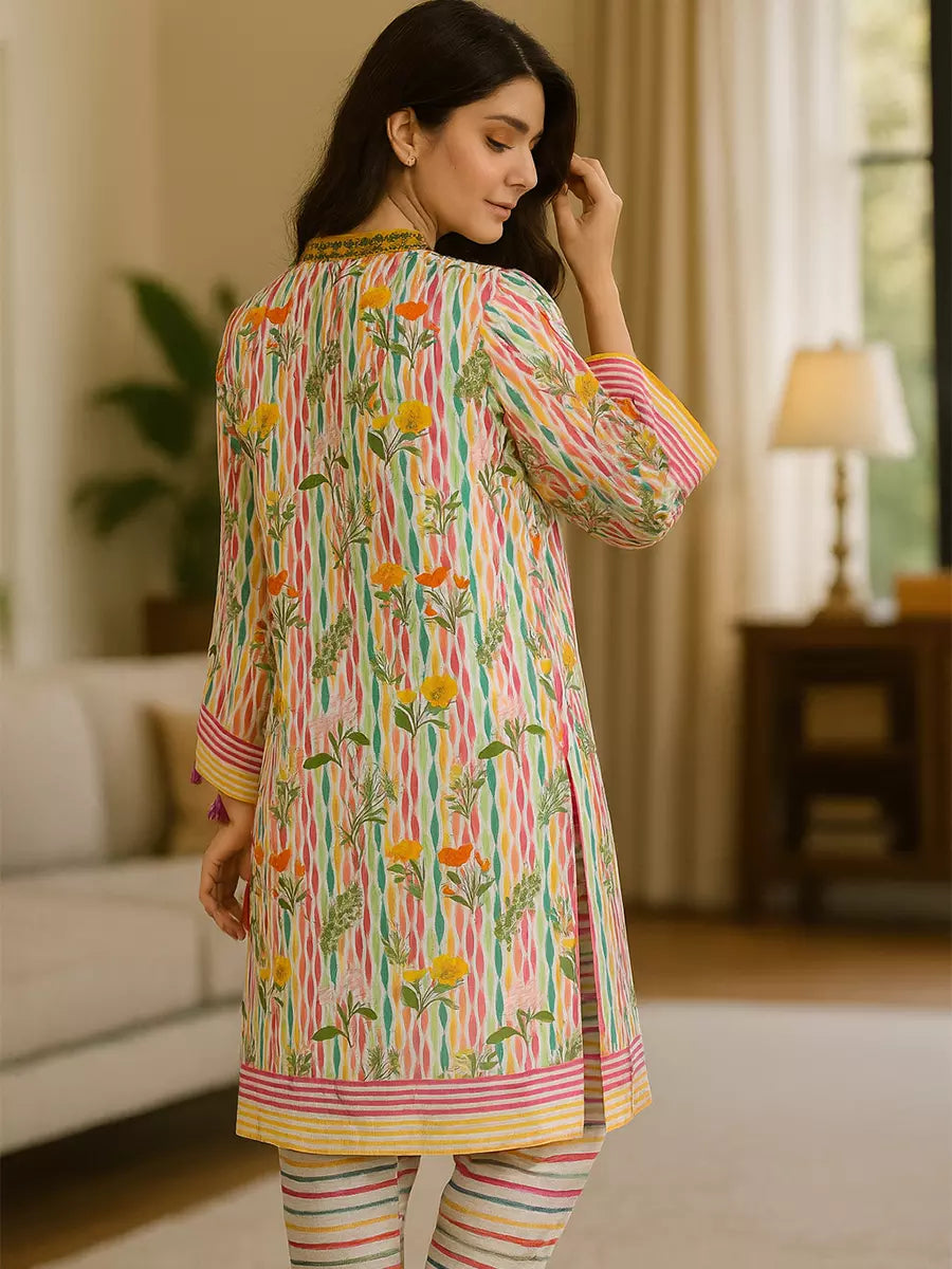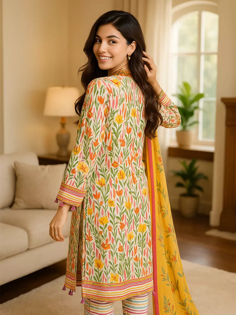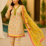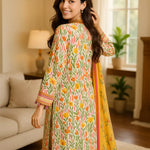 Elegant 3-piece suit in premium printed lawn silk. Includes a breathable shirt, trousers, and a lightweight dupatta. Perfect for any occasion.