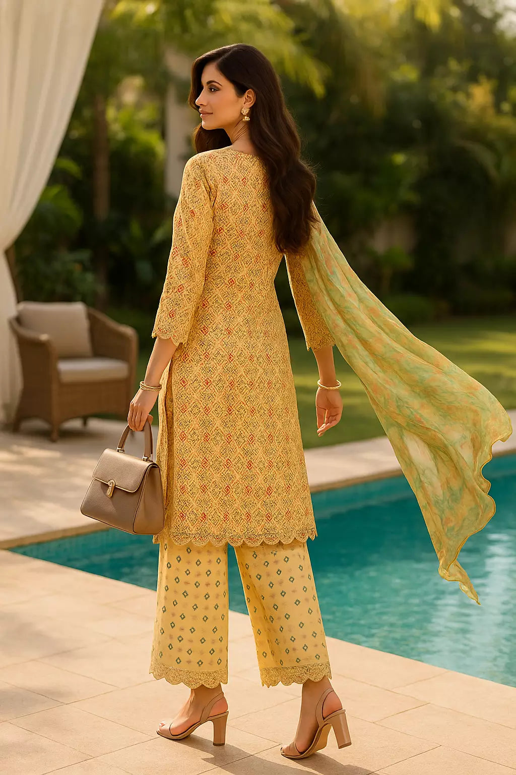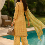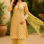 Elegant 3-piece suit in premium printed lawn silk. Includes a breathable shirt, trousers, and a lightweight dupatta. Perfect for any occasion.