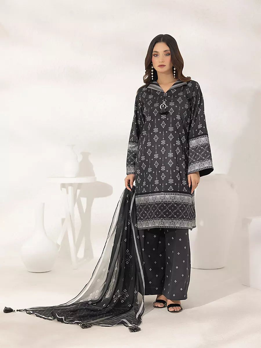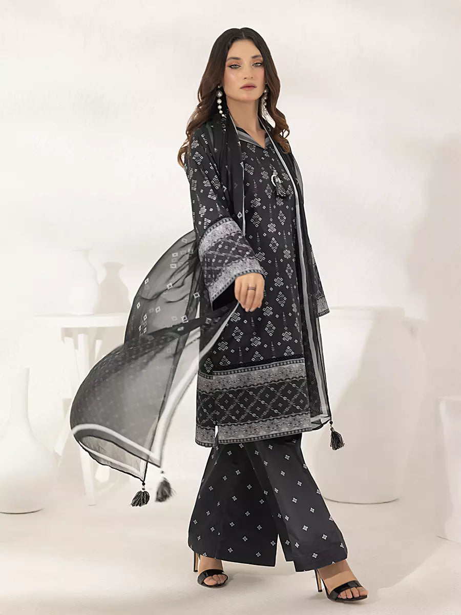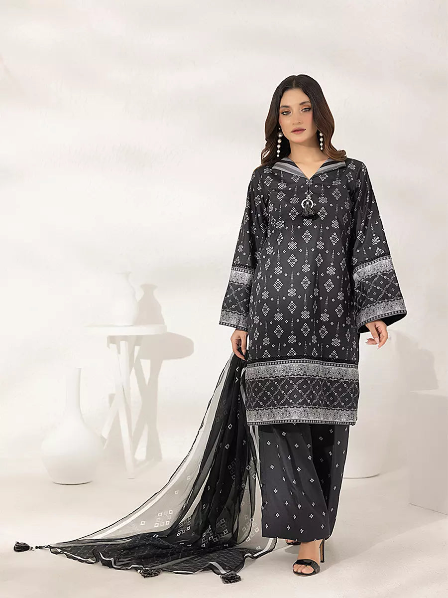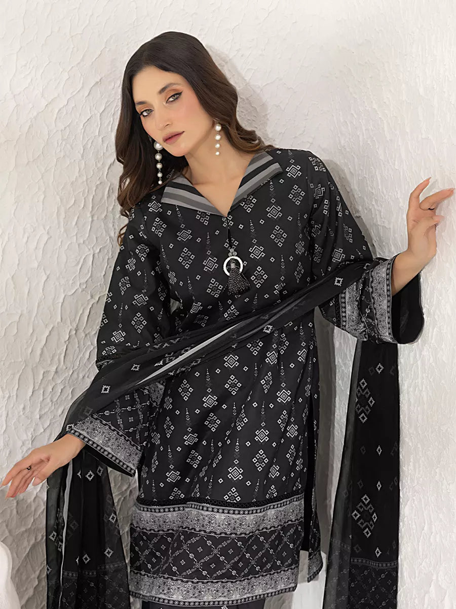 Elegant 3-piece suit in premium printed lawn silk. Includes a breathable shirt, trousers, and a lightweight dupatta. Perfect for daily wear.
