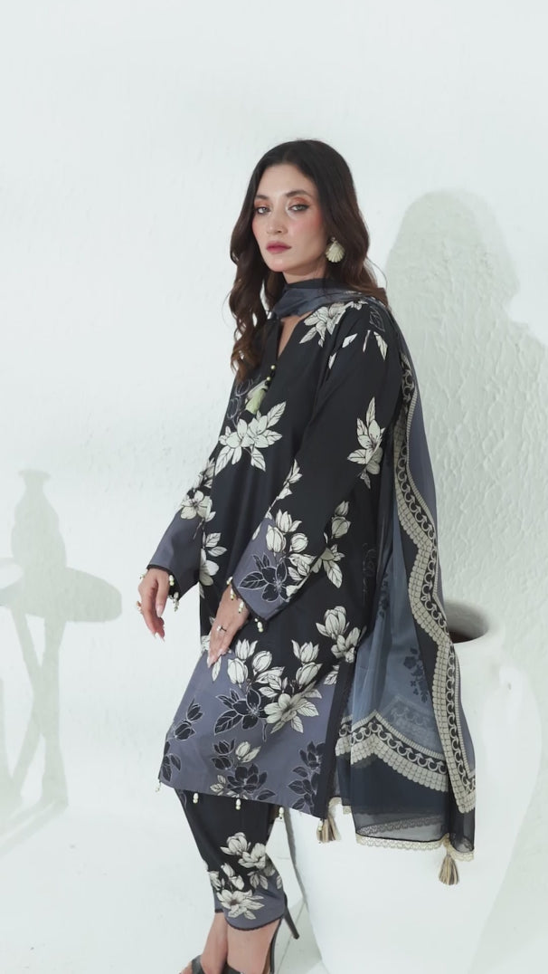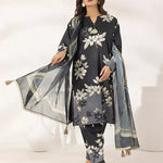 Elegant 3-piece suit in premium printed lawn silk. Includes a breathable shirt, trousers, and a lightweight dupatta. Perfect for daily wear.