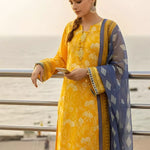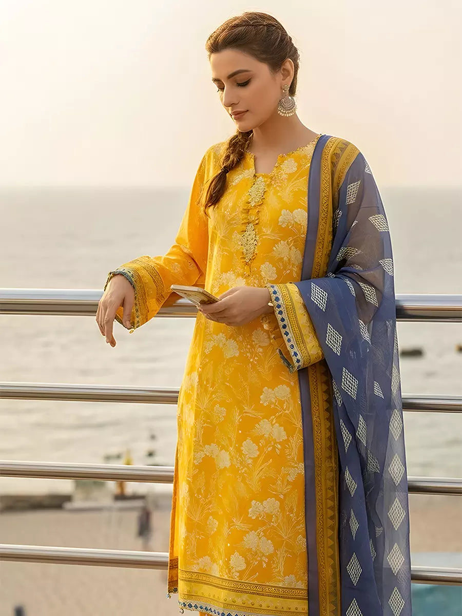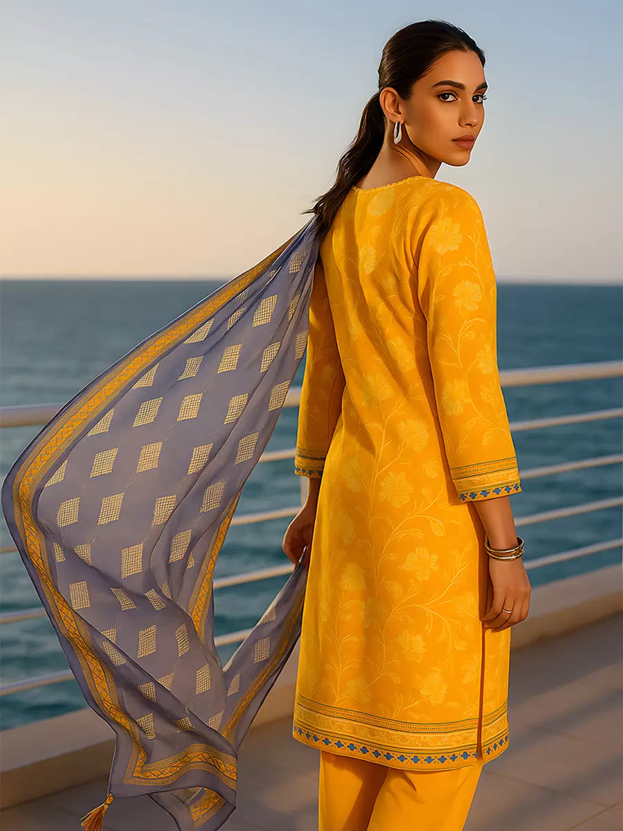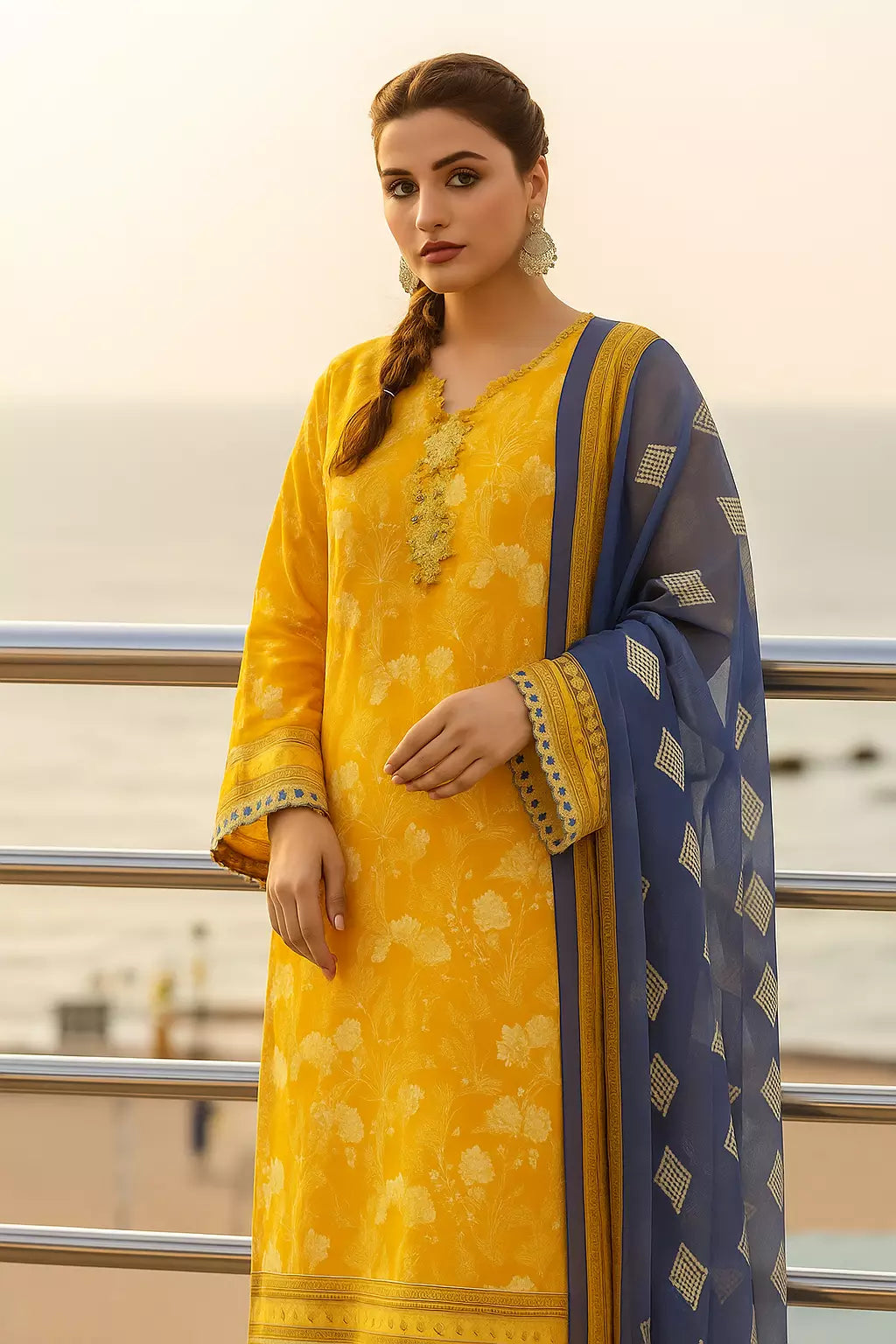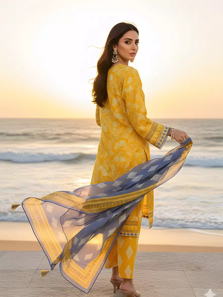 Elegant 3-piece suit in premium printed lawn silk. Includes a breathable shirt, trousers, and a lightweight dupatta. Perfect for any occasion.