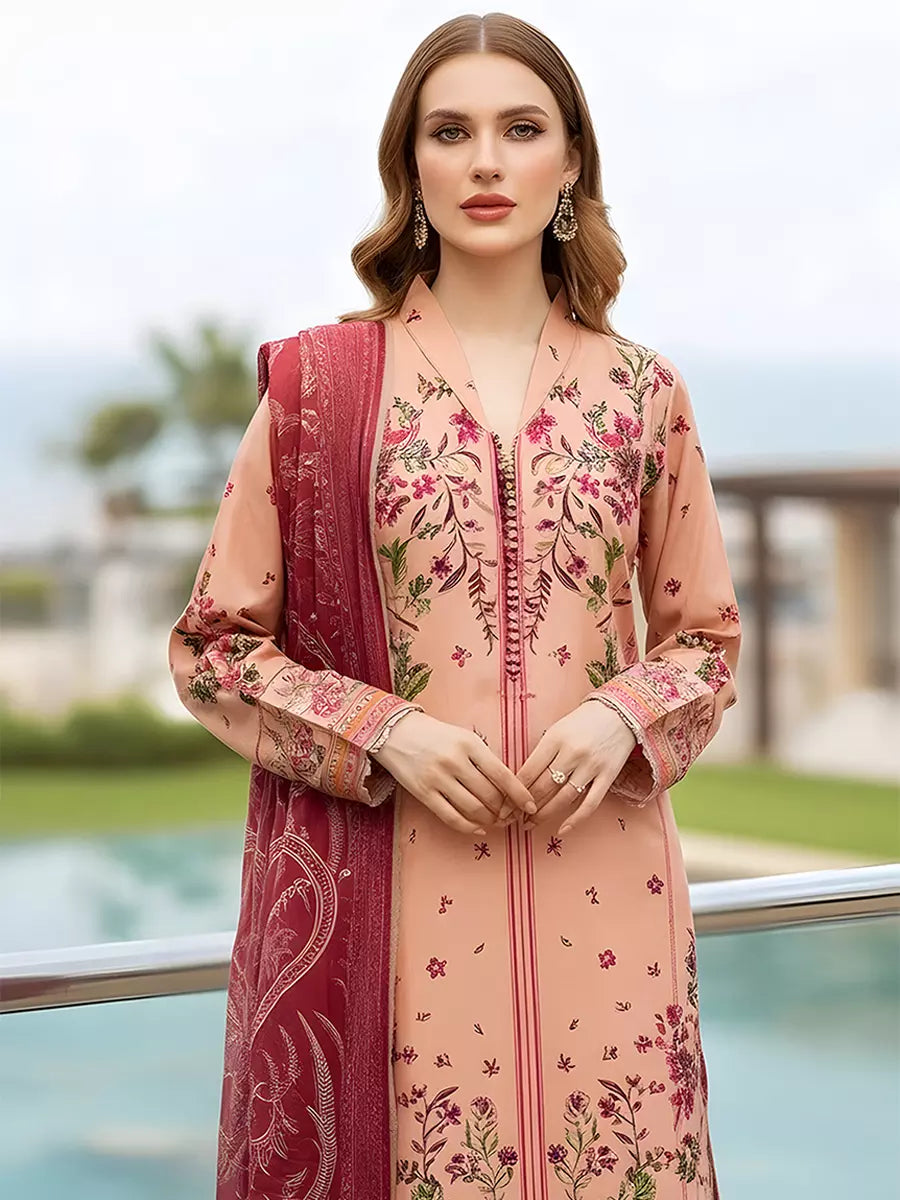 Elegant 3-piece suit in premium printed lawn silk. Includes a breathable shirt, trousers, and a lightweight dupatta. Perfect for any occasion.