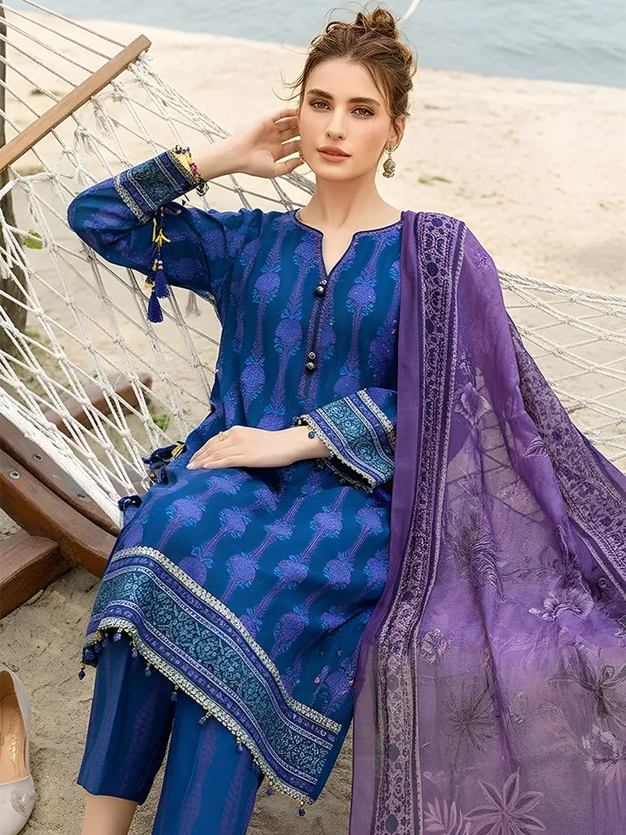 Elegant 3-piece suit in premium printed lawn silk. Includes a breathable shirt, trousers, and a lightweight dupatta. Perfect for any occasion.