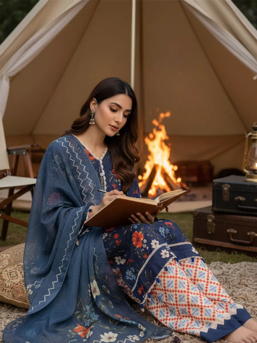 Elegant 3-piece suit in premium printed lawn silk. Includes a breathable shirt, trousers, and a lightweight dupatta. Perfect for any occasion.