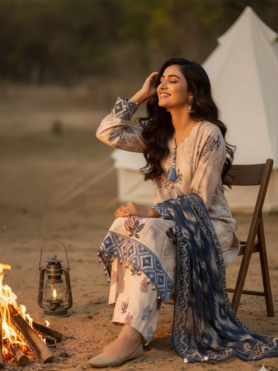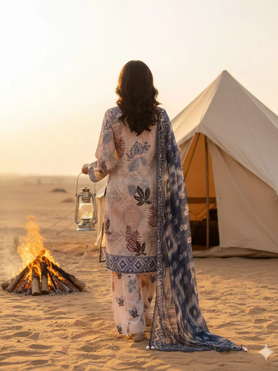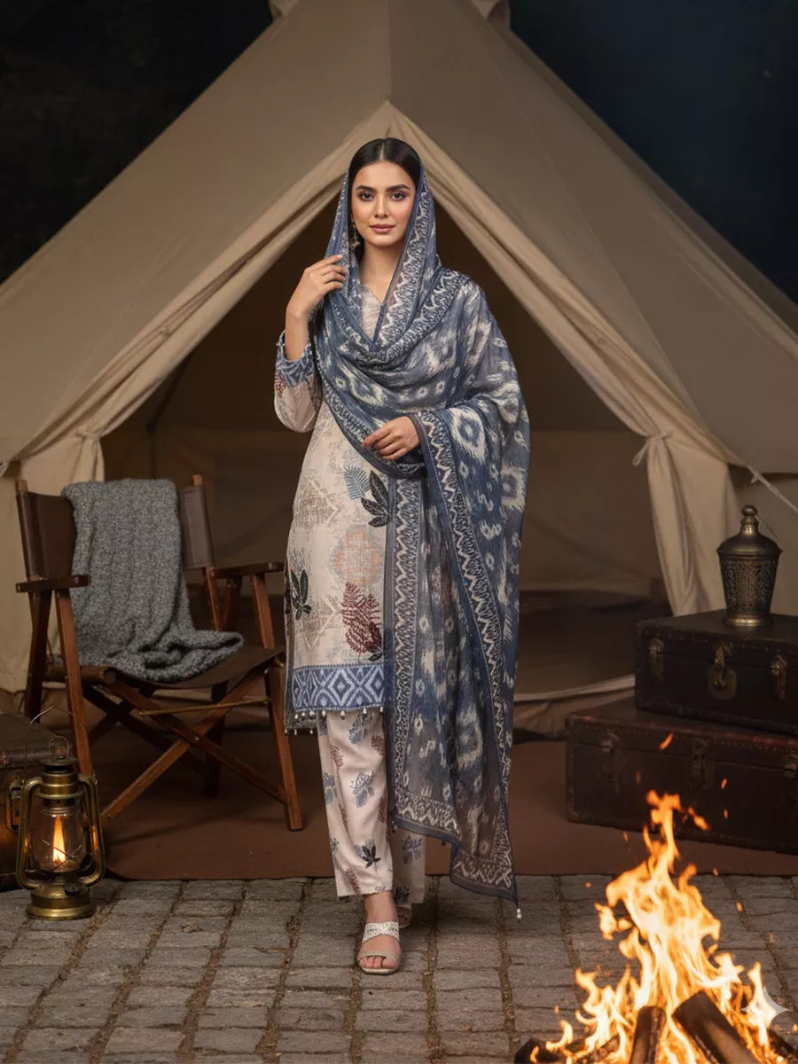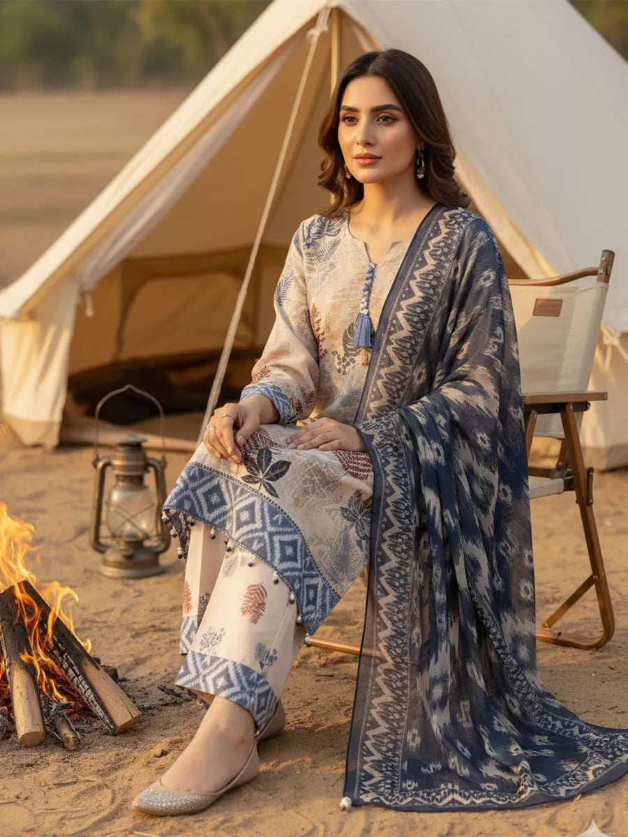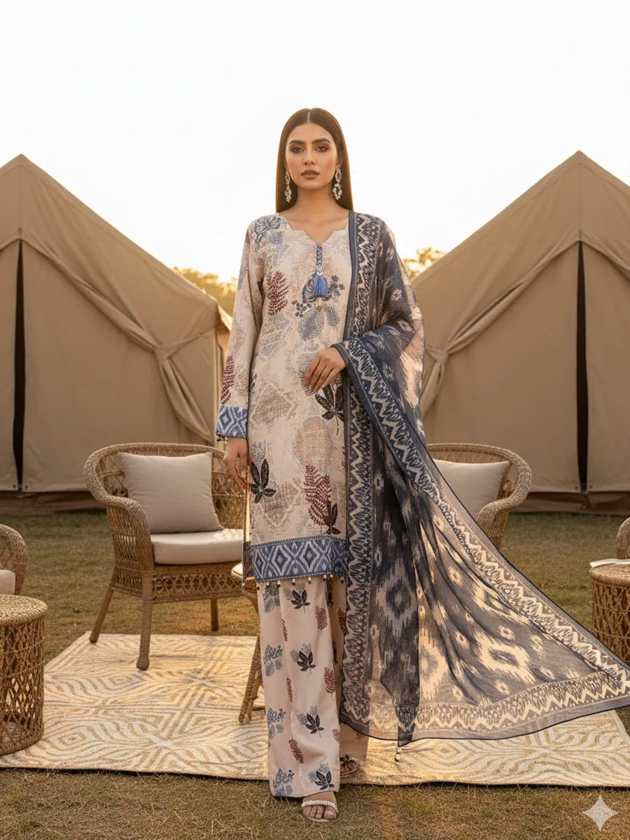Elegant 3-piece suit in premium printed lawn silk. Includes a breathable shirt, trousers, and a lightweight dupatta. Perfect for any occasion.