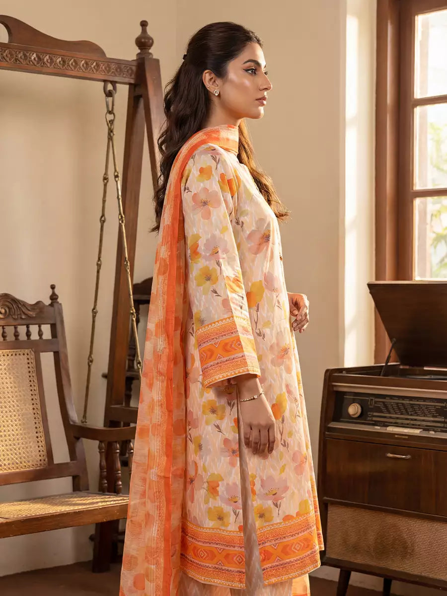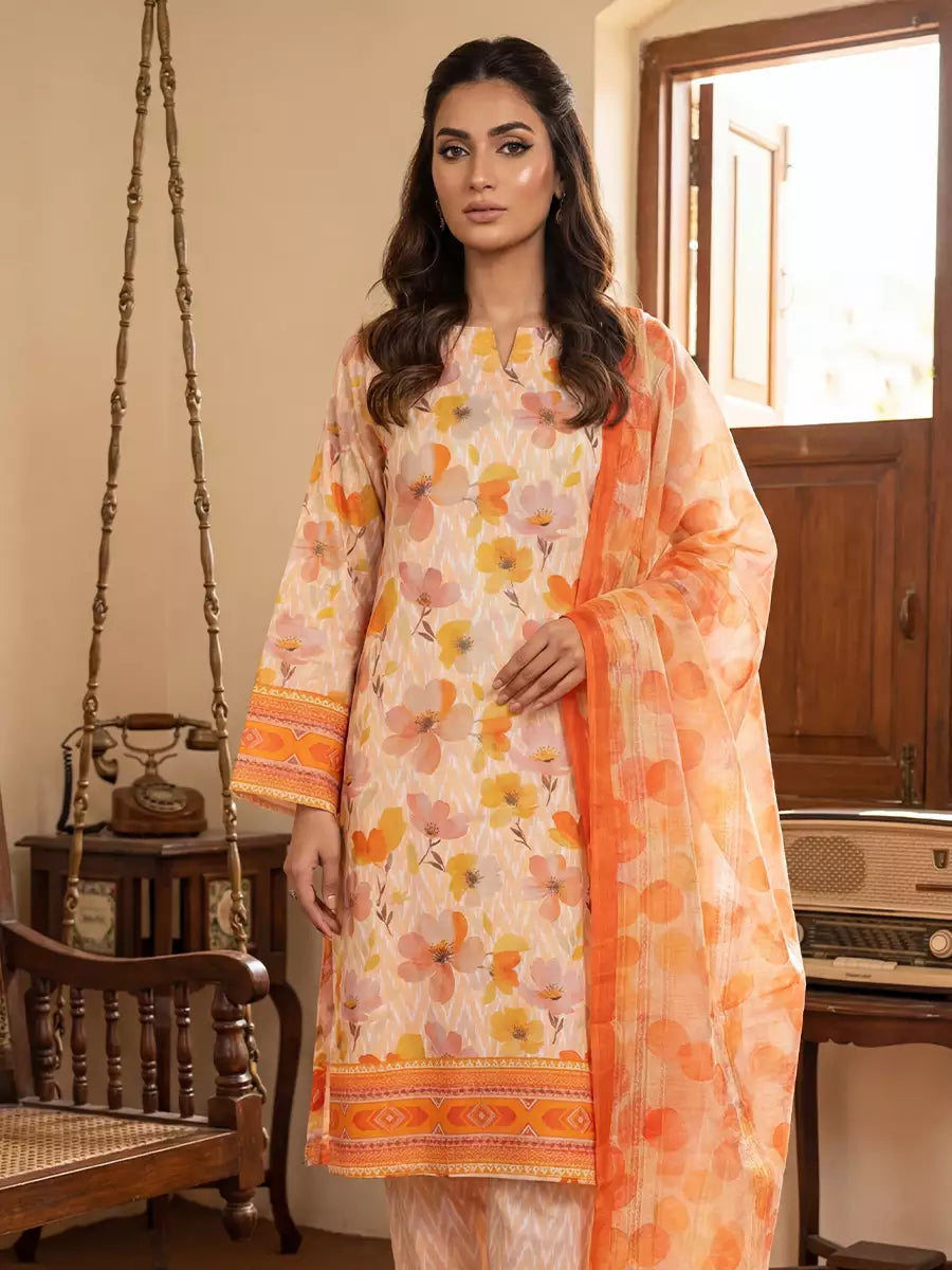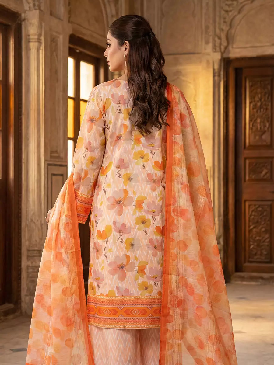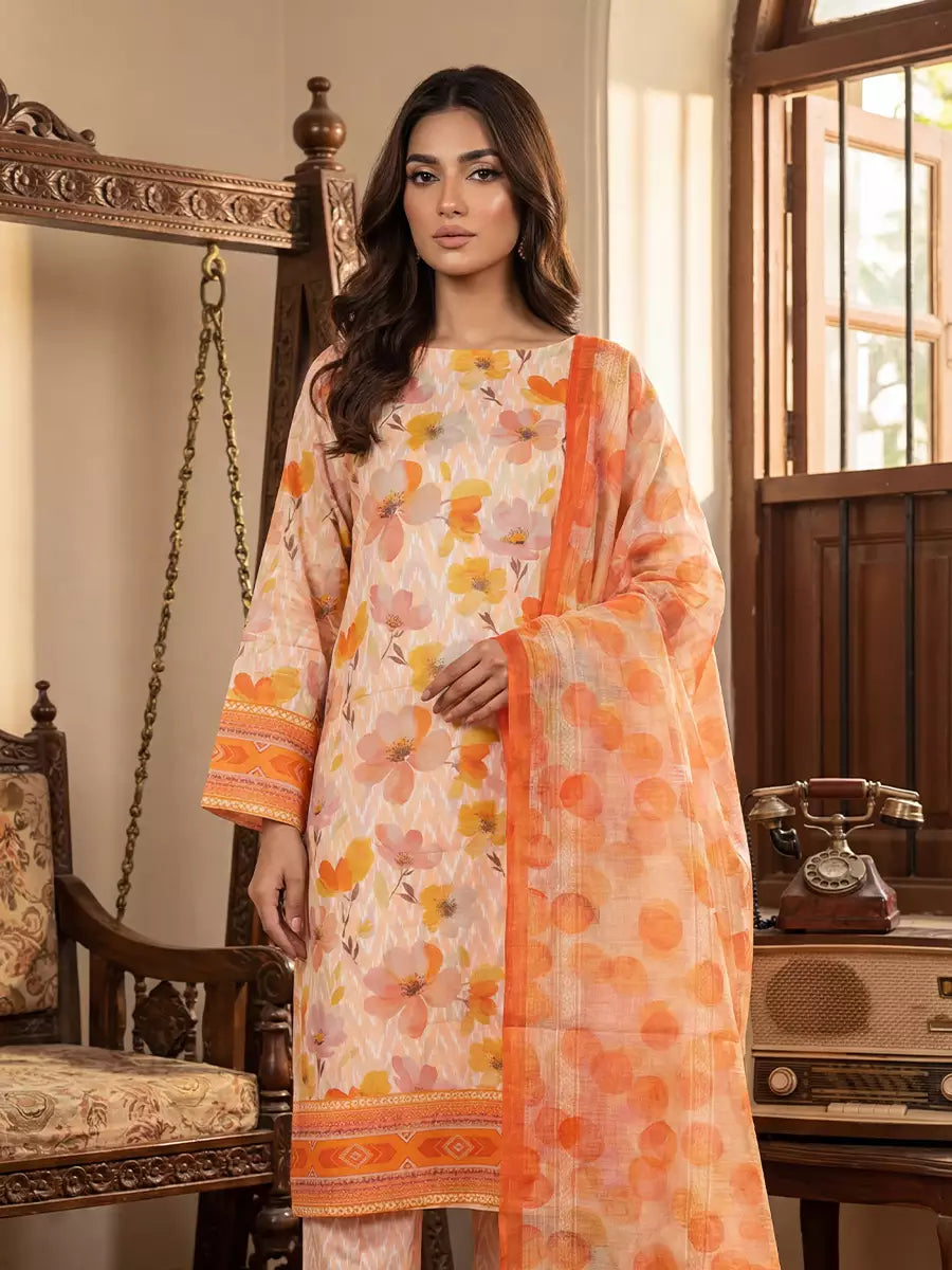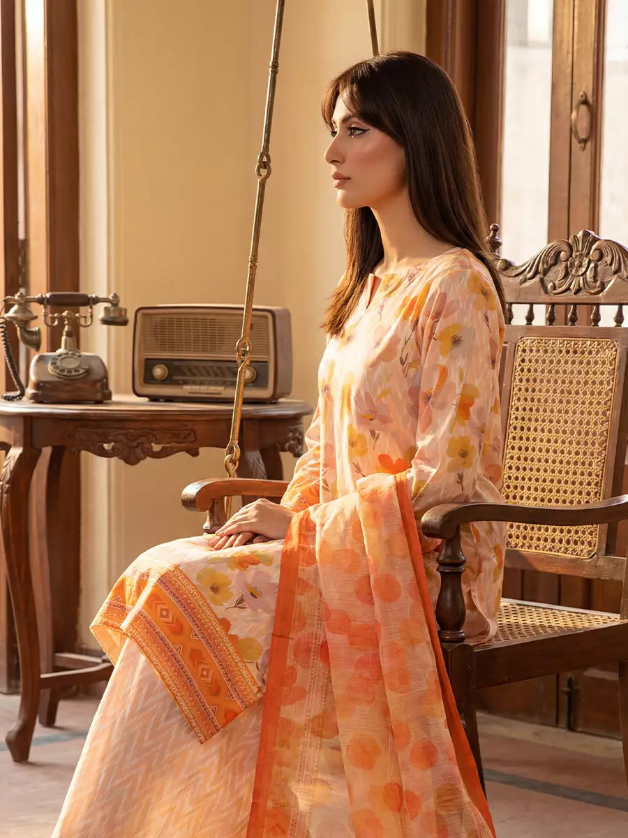Elegant 3-piece suit in premium printed Silk Lawn. Includes a breathable shirt,trousers, and lightweight dupatta. Perfect for any occasion