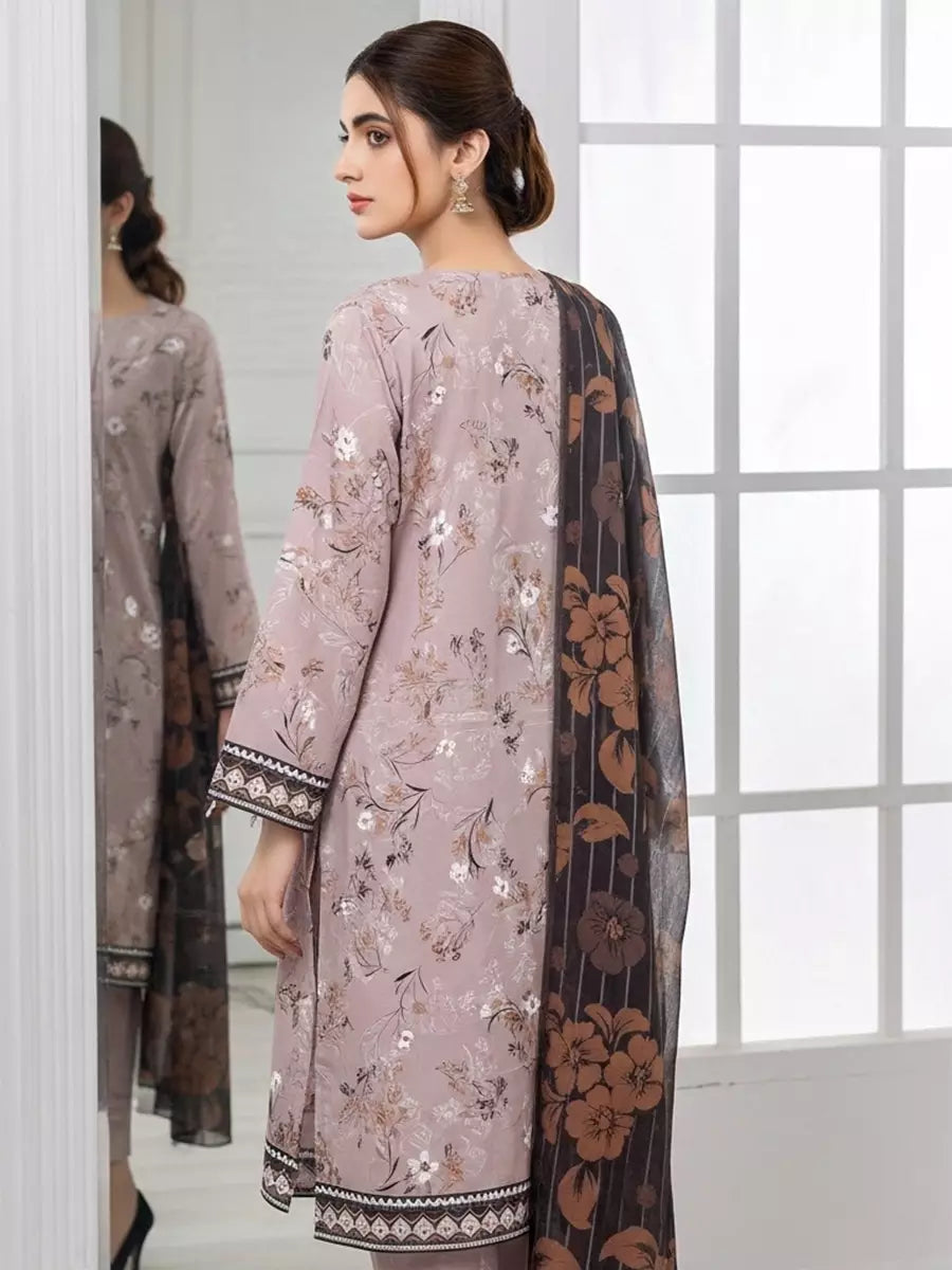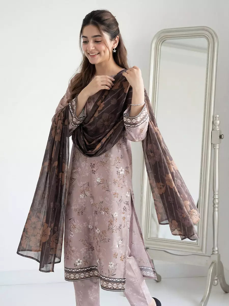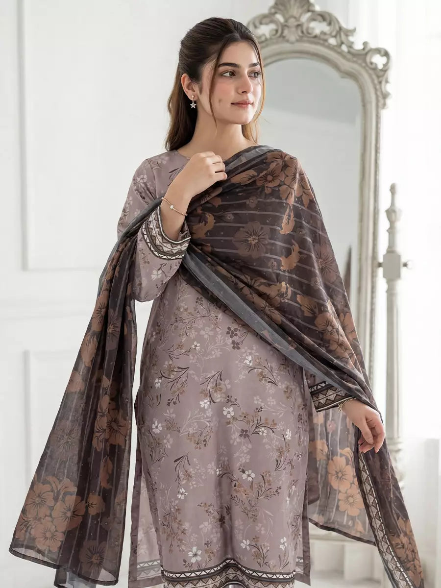 Elegant 3-piece suit in premium printed lawn silk. Includes a breathable shirt, trousers, and a lightweight dupatta. Perfect for any occasion.