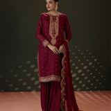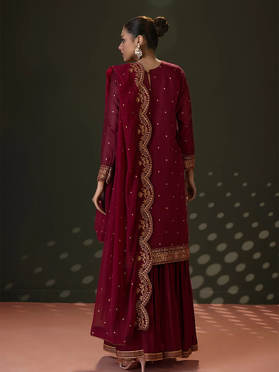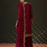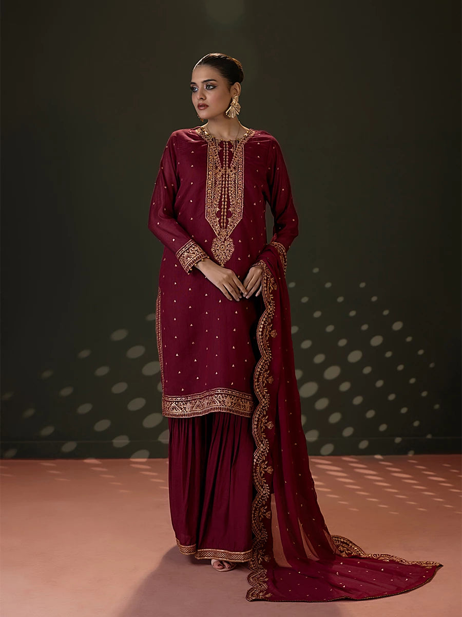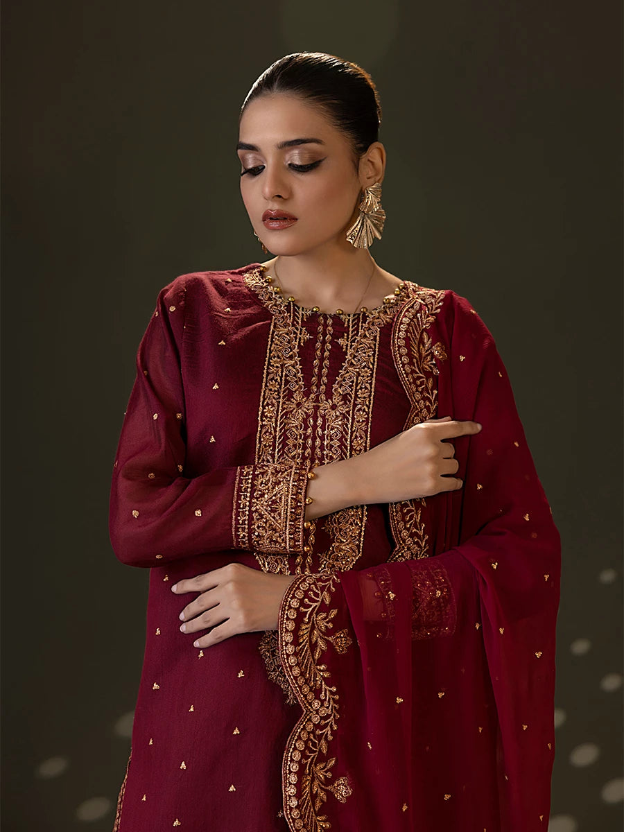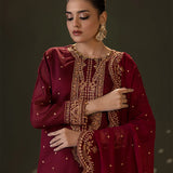 Elevate your elegance with our 3-piece maroon ensemble: a cotton net shirt, raw silk trouser, and chiffon dupatta, perfect for a graceful, timeless look.