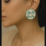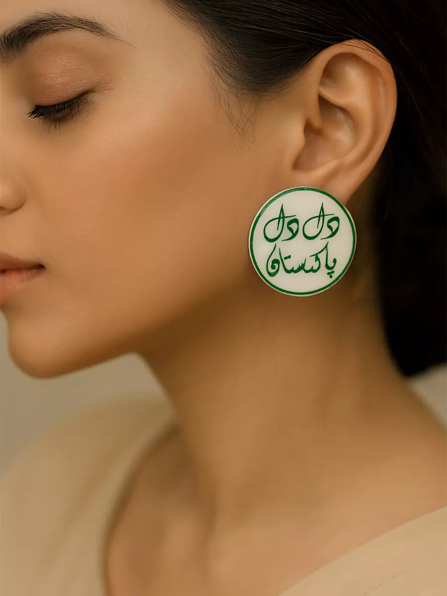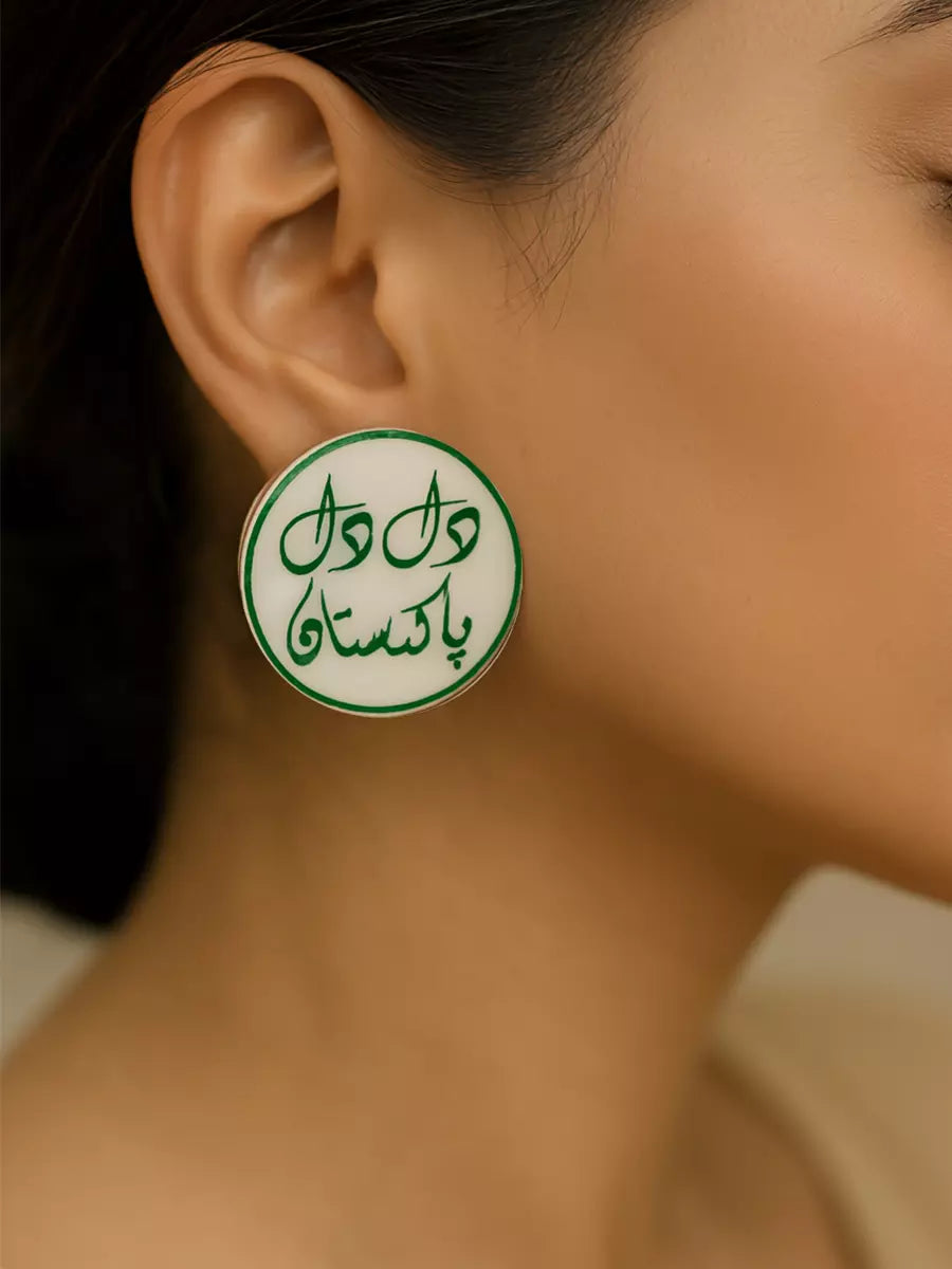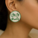 Handmade resin earrings shaped like Pakistan with "Dil Dil Pakistan" written to reflect your love
