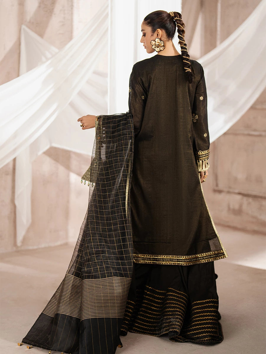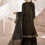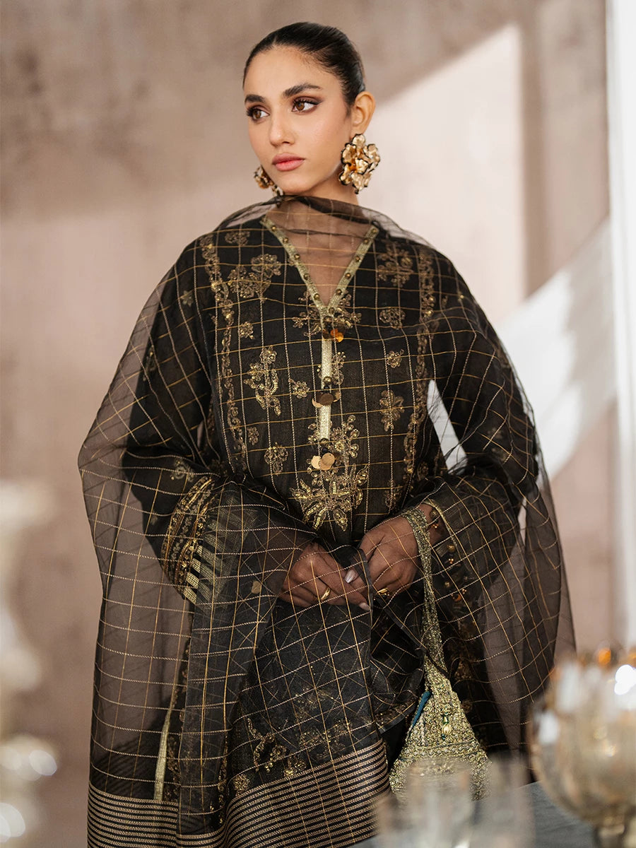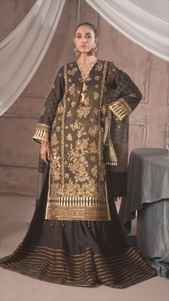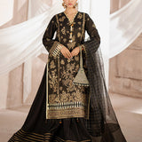 Luxury embroidered net front with dori and sequin detailing, paired with dyed lurex cotton net back, side panels, and sleeves featuring intricate embroidery. Includes an embroidered net embellished dupatta, plain crape trousers, and beautifully embroidered borders for a sophisticated finish.