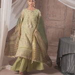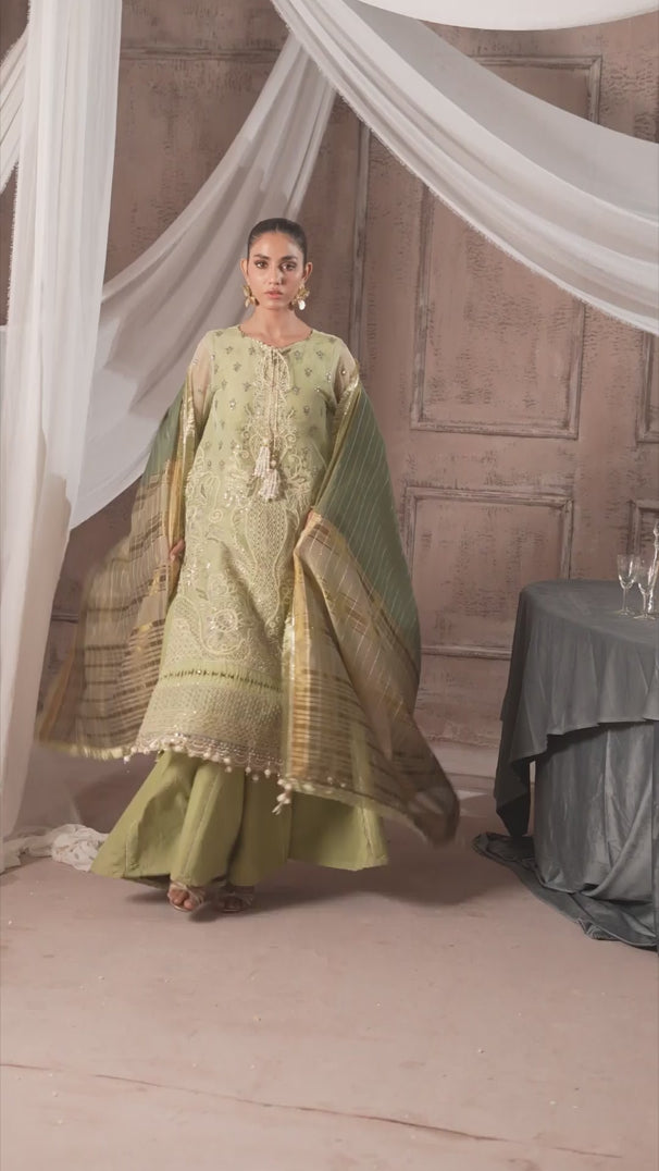 Luxury embroidered net front with dori and sequin detailing, paired with dyed lurex cotton net back, side panels, and sleeves featuring intricate embroidery. Includes an embroidered net embellished dupatta, plain crape trousers, and beautifully embroidered borders for a sophisticated finish.