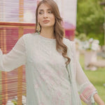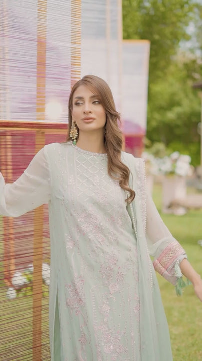 Embrace elegance in our pastel green chiffon ensemble, delicately embellished with zari and sequins—ideal for a soft, festive touch