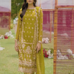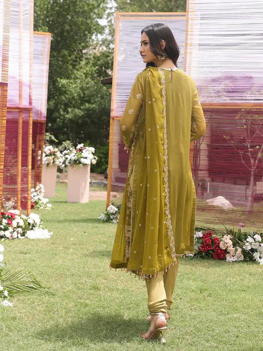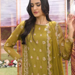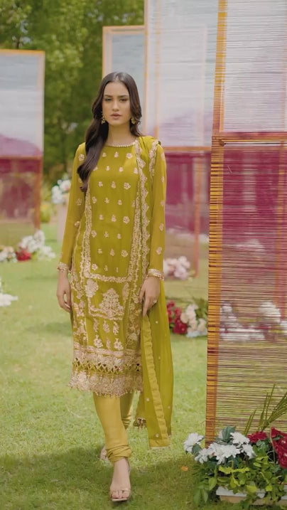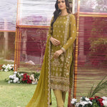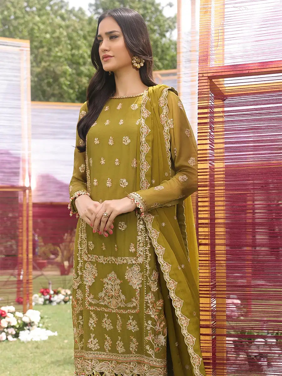 Celebrate tradition in our mehndi green chiffon ensemble, beautifully adorned with intricate zari and sequin work—perfect for a rich and festive look