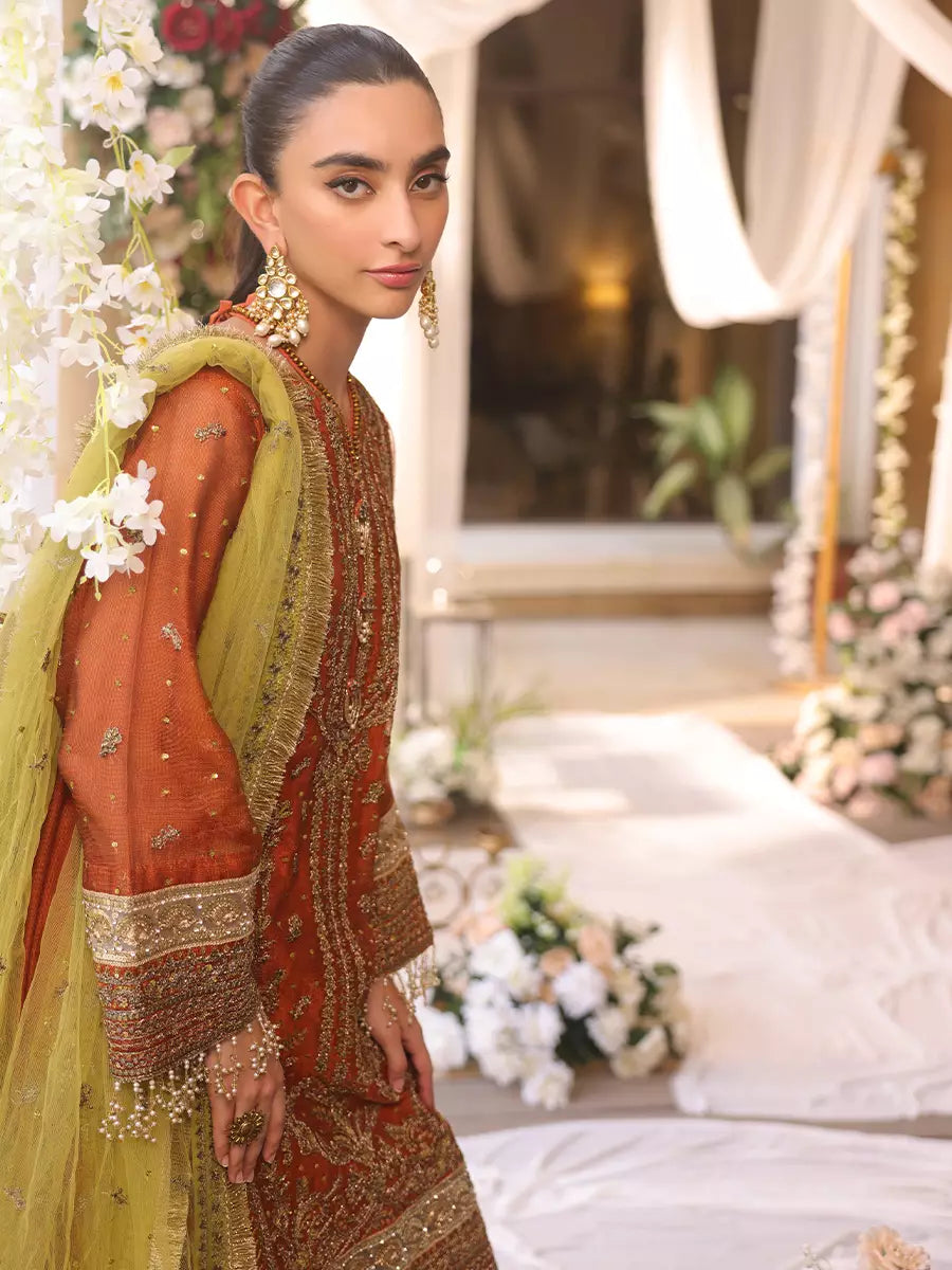 Embrace opulence with our luxurious maroon ensemble, adorned with intricate embroidery and regal zari work in gold. A timeless masterpiece that exudes royalty and elegance in every stitch