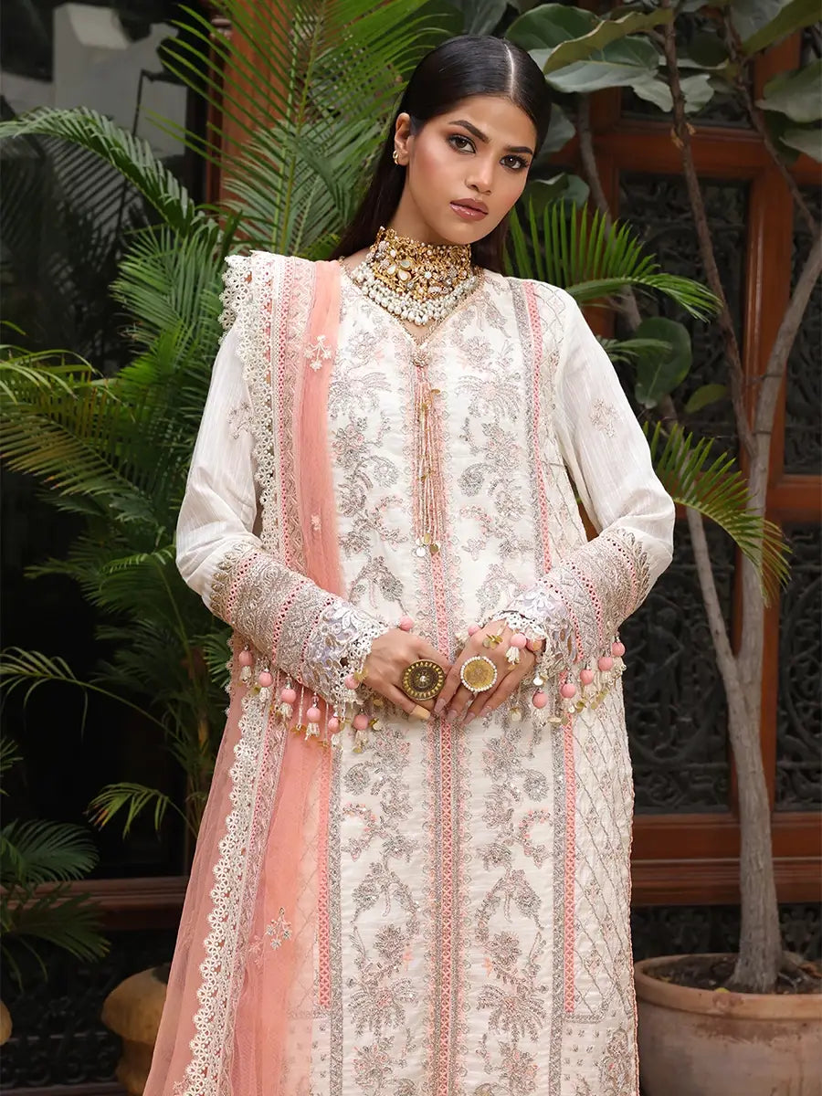 Embrace grace and charm with our ivory and pink ensemble, adorned with exquisite embroidery and shimmering sequins. This elegant combination is perfect for adding a touch of sophistication to your wardrobe.