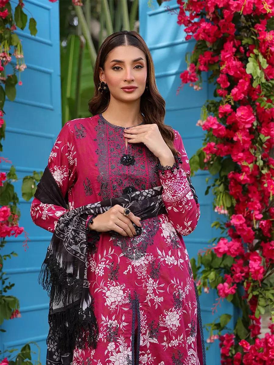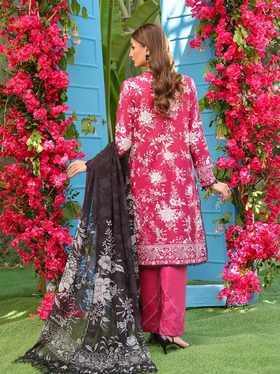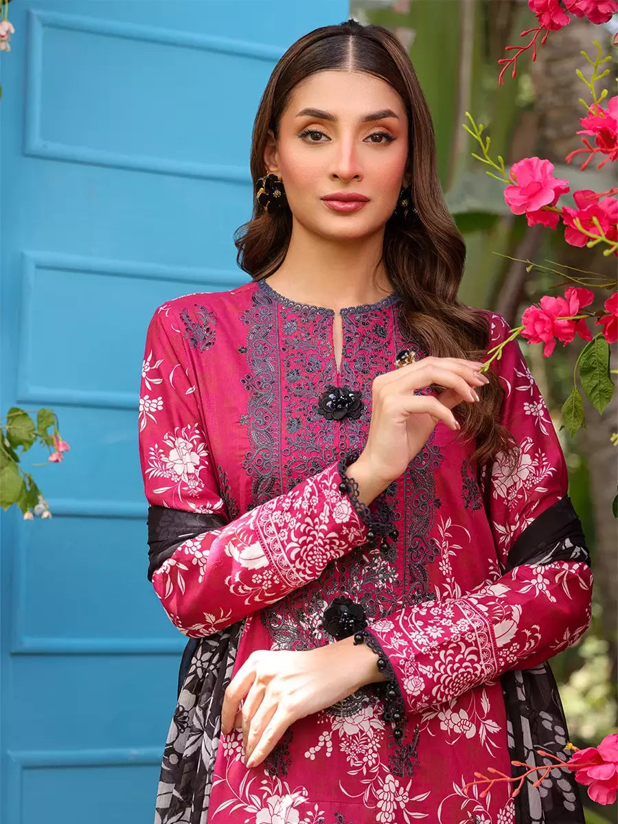 Elevate your look with this chic cambric printed and embroidered shirt, paired with a flowing printed chiffon dupatta. Complete the outfit with a perfectly dyed cambric trouser for a graceful finish