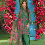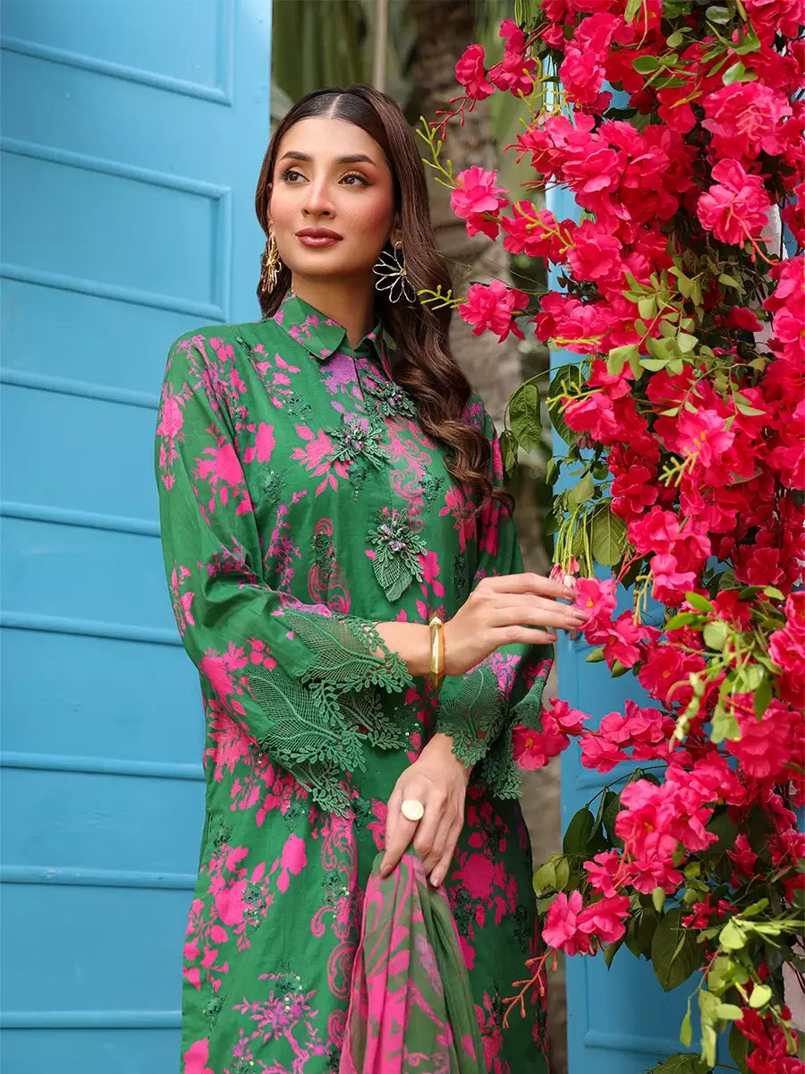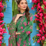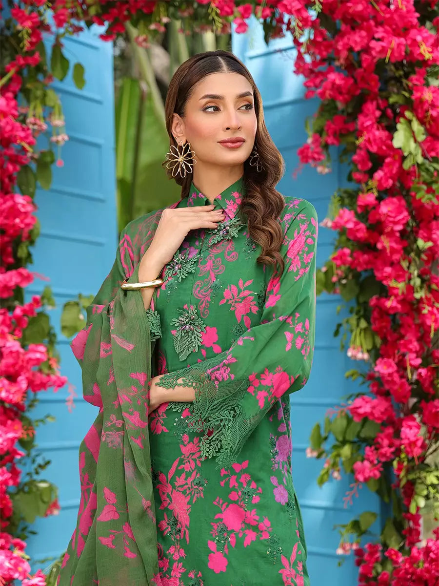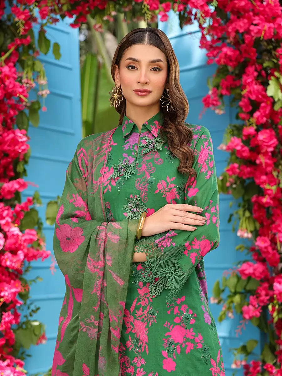 Elevate your look with this chic cambric printed and embroidered shirt, paired with a flowing printed chiffon dupatta. Complete the outfit with a perfectly dyed cambric trouser for a graceful finish