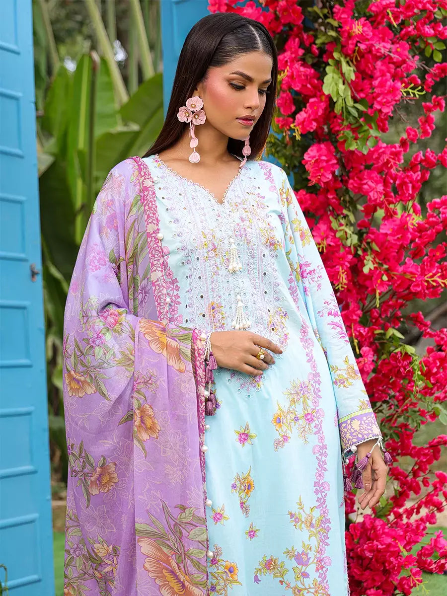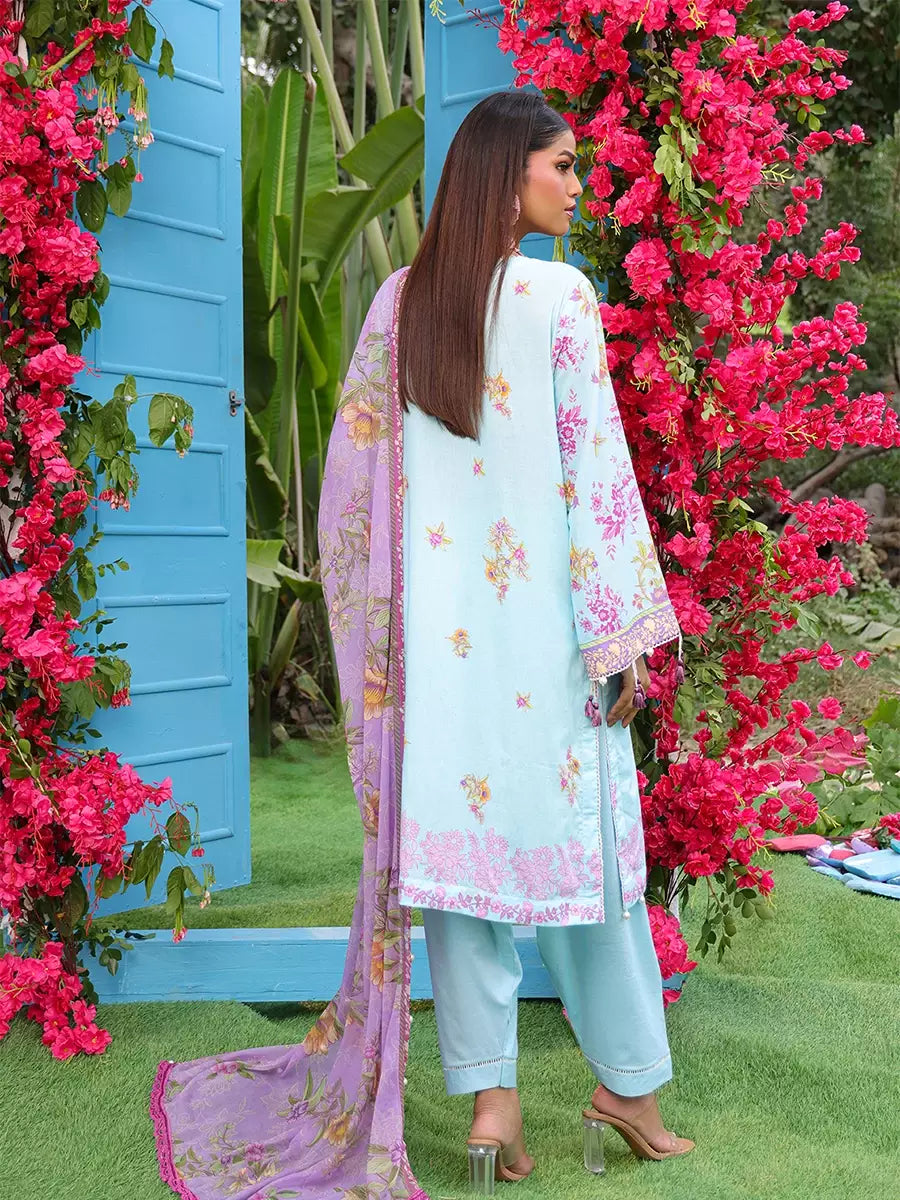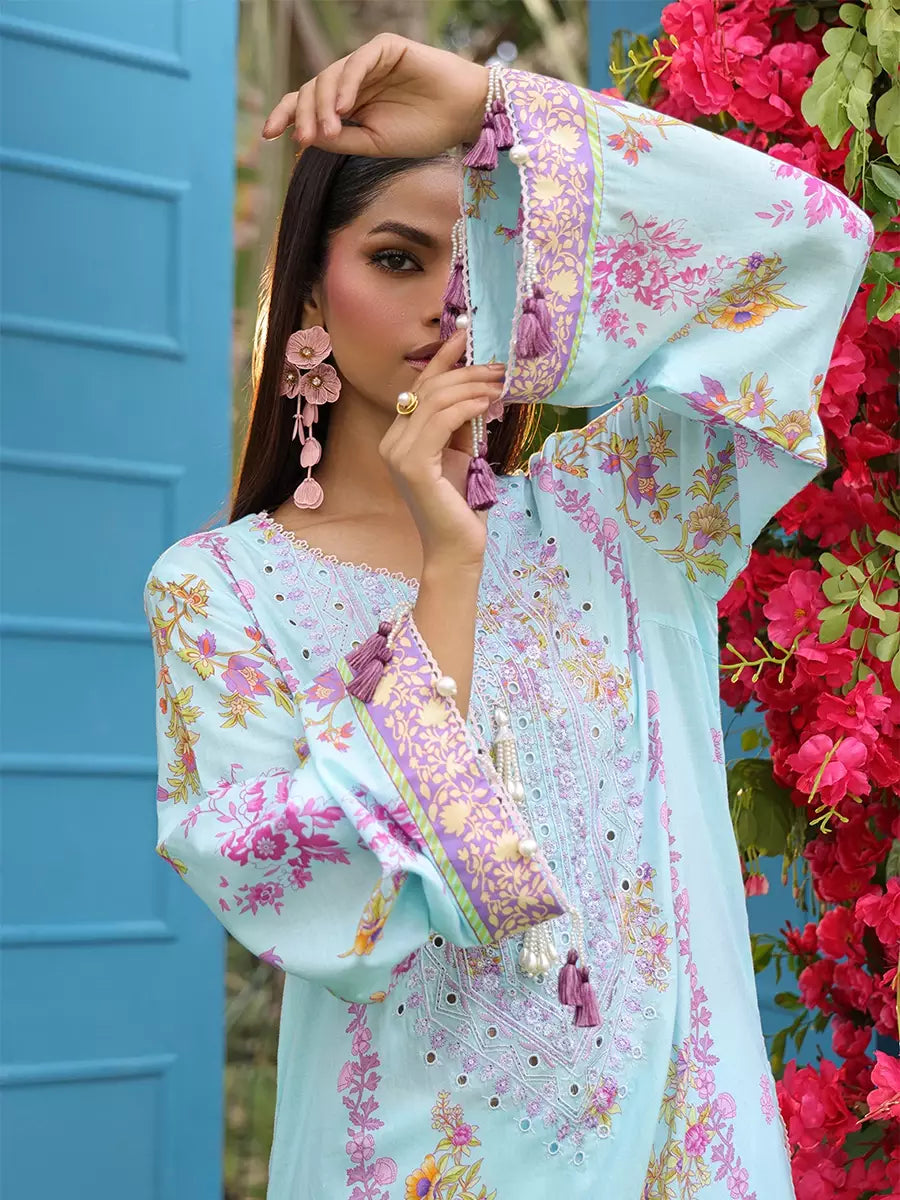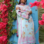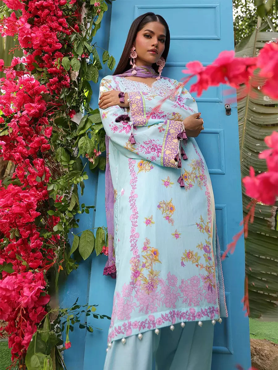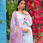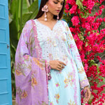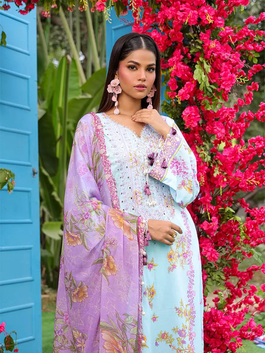 Elevate your look with this chic cambric printed and embroidered shirt, paired with a flowing printed chiffon dupatta. Complete the outfit with a perfectly dyed cambric trouser for a graceful finish