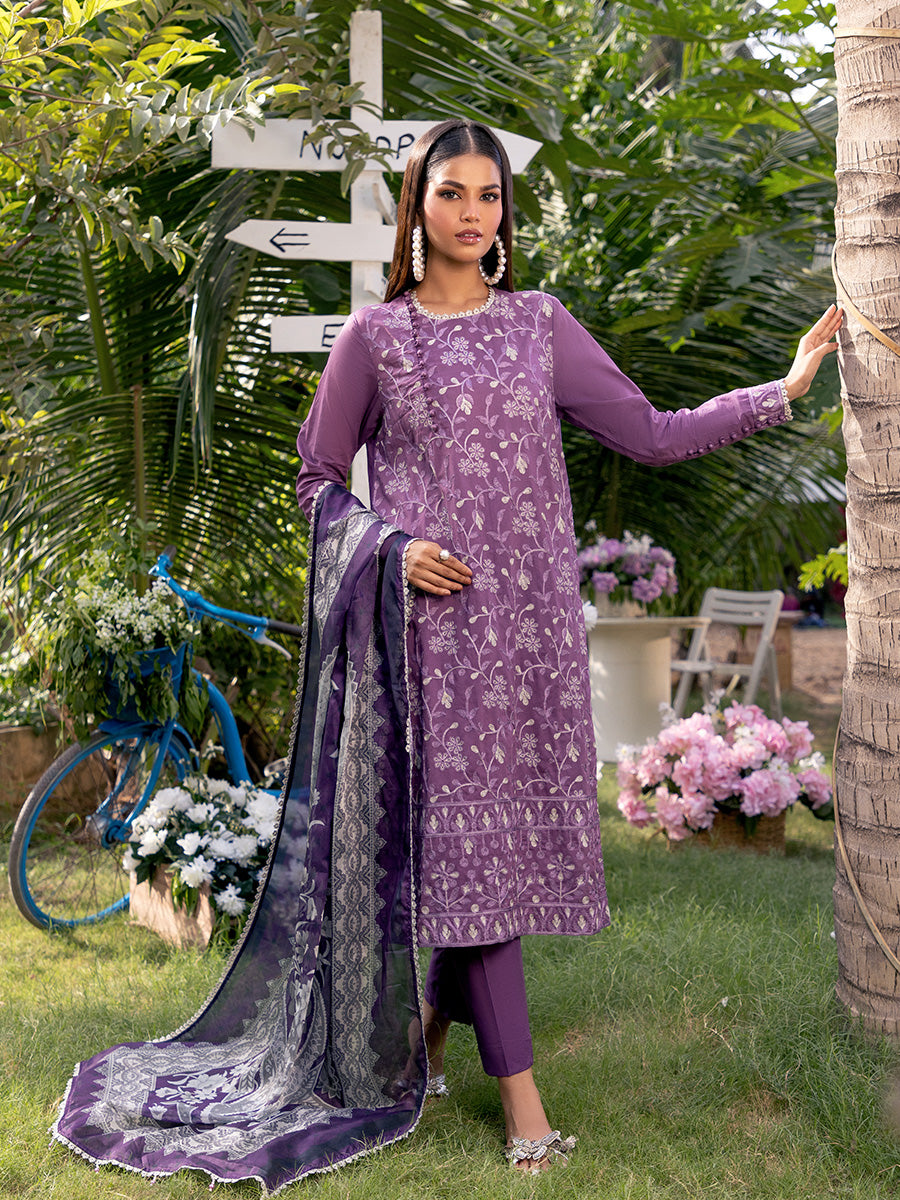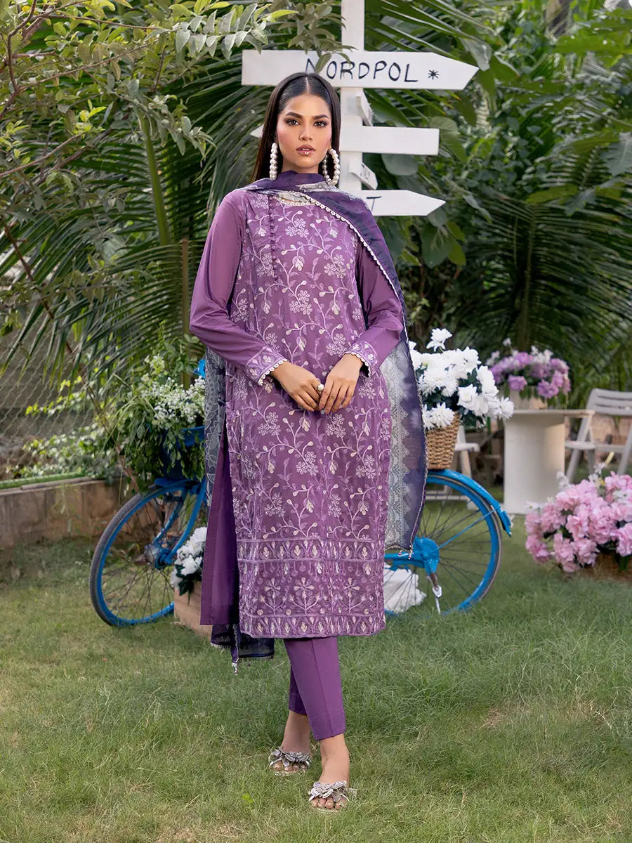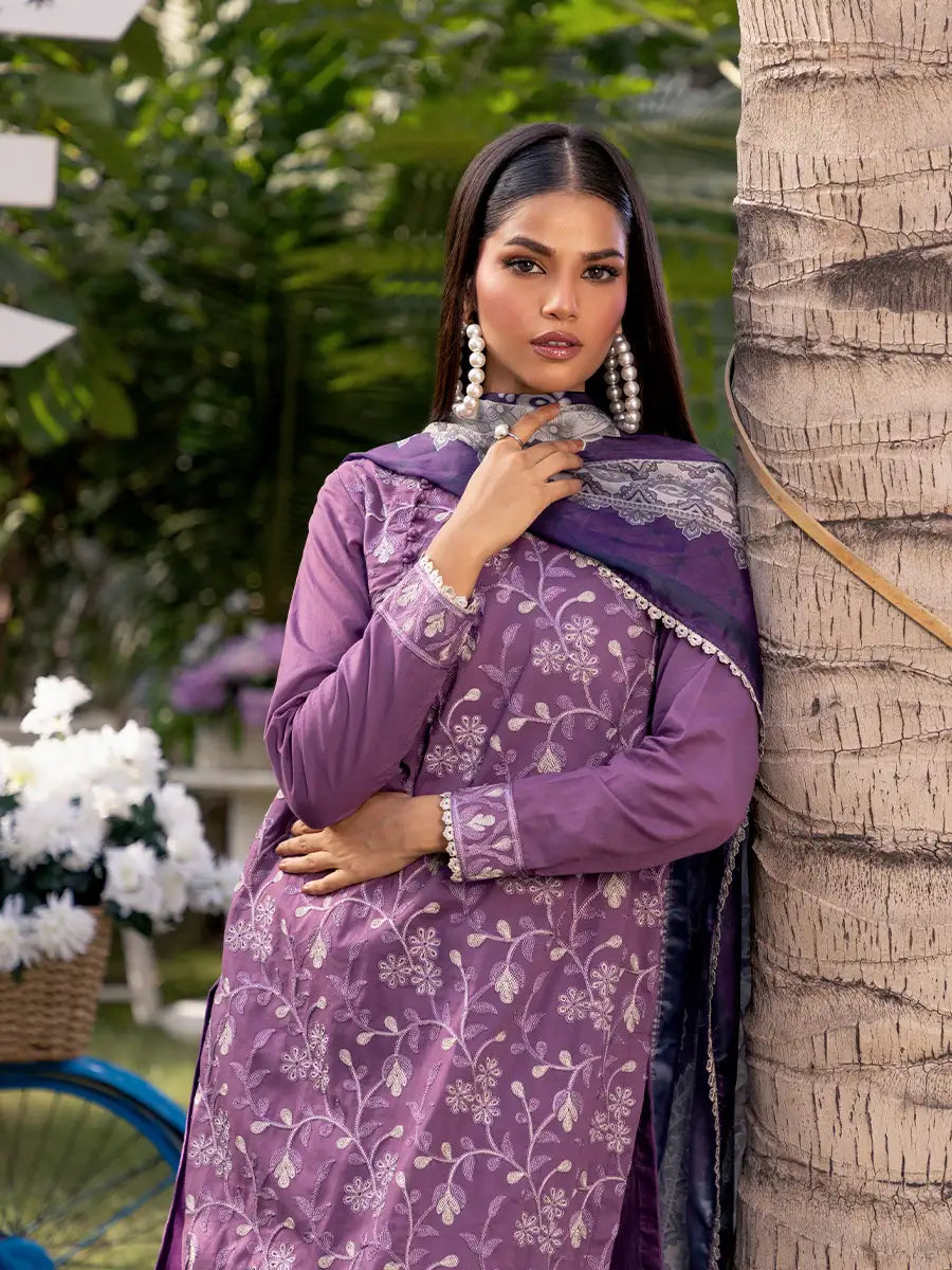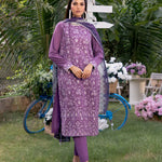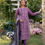 Step into elegance with this purple 3-piece unstitched suit, featuring intricate front embroidery and a vibrant printed dupatta. A perfect mix of grace and style at an affordable price