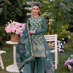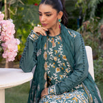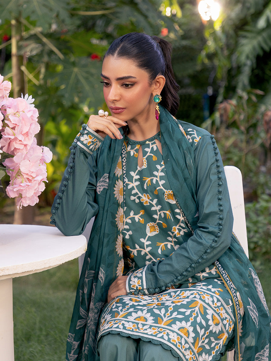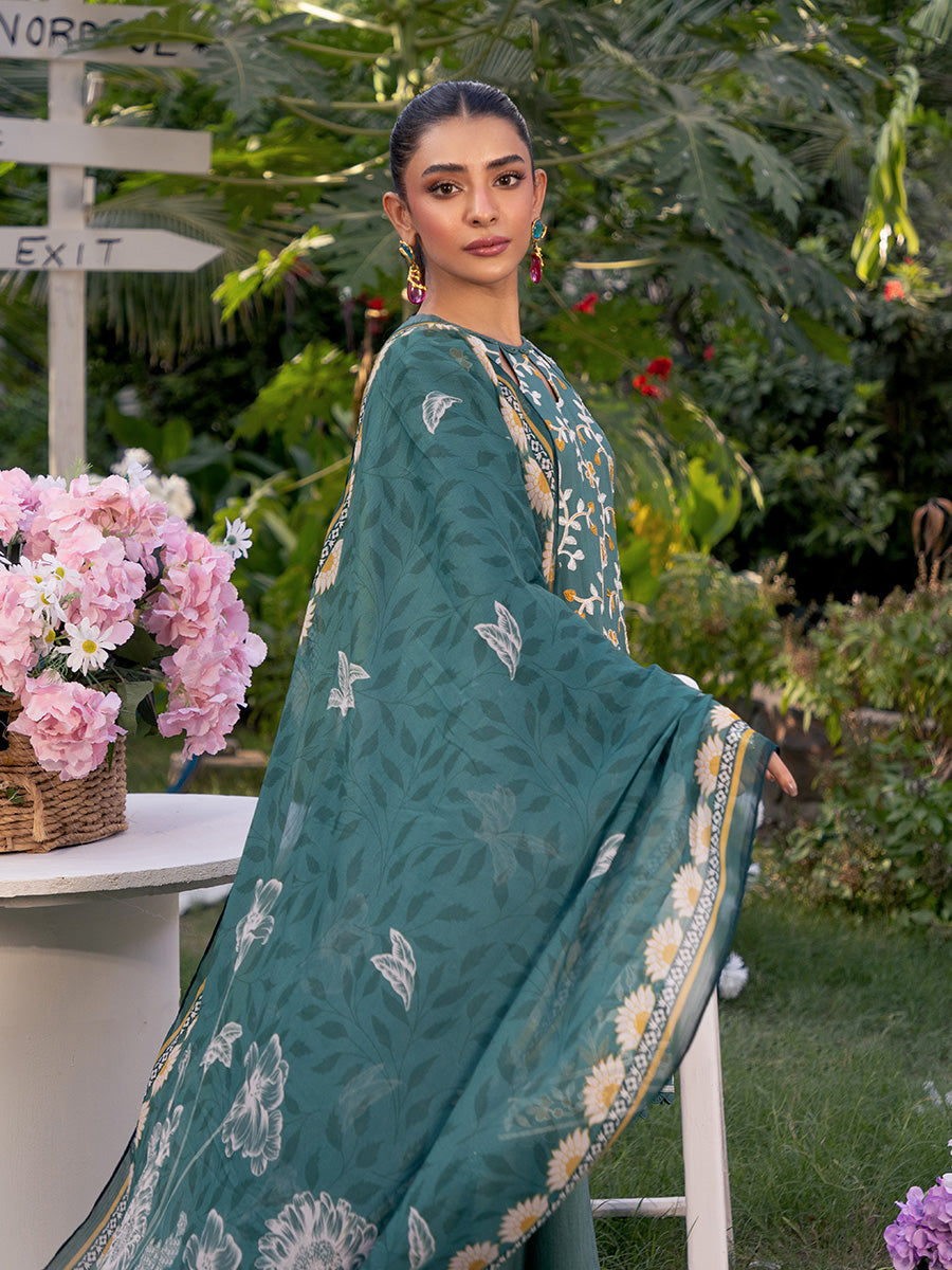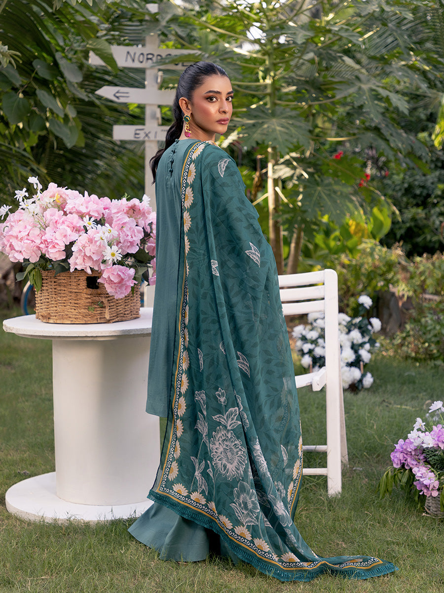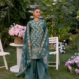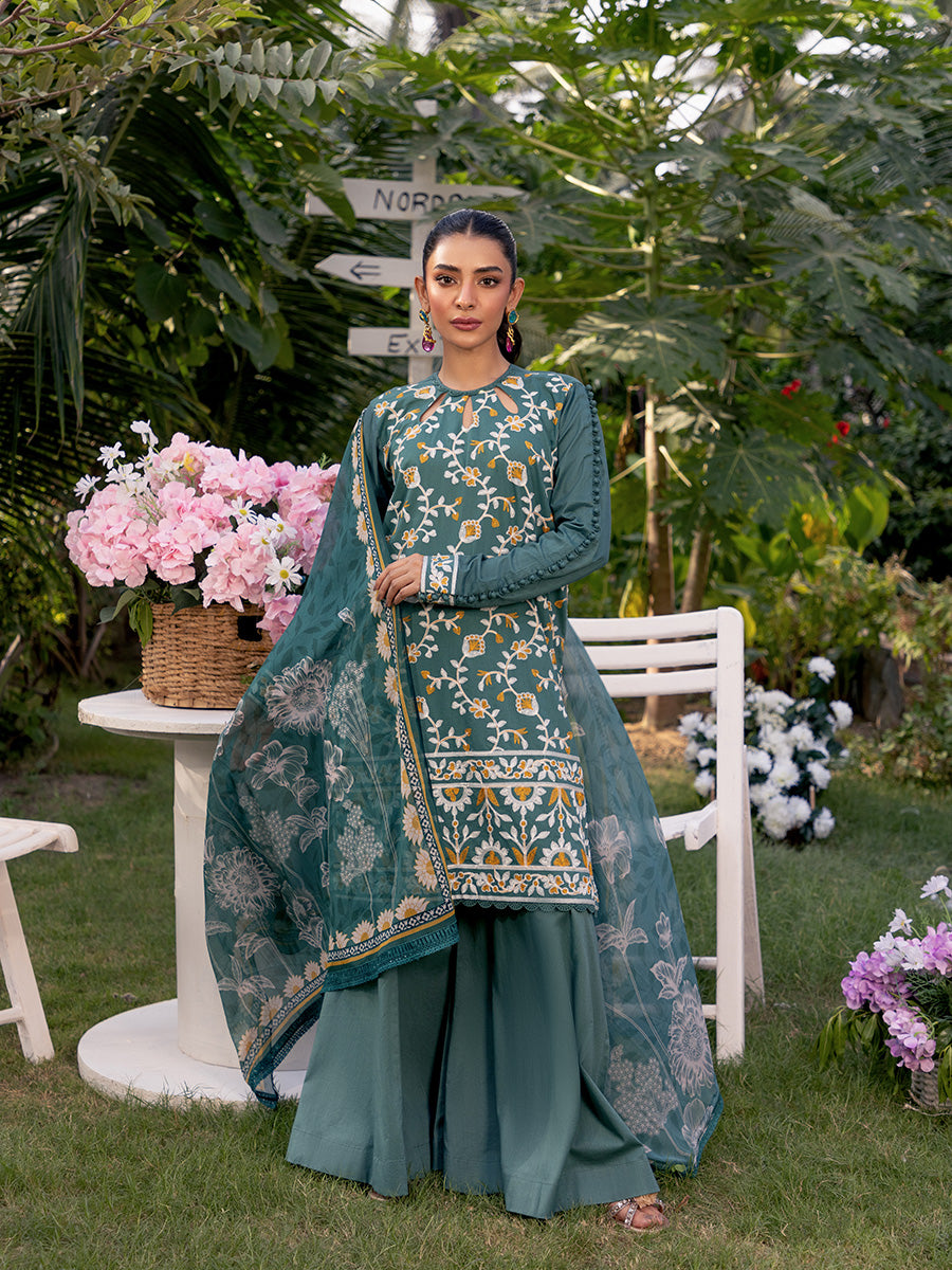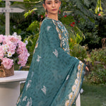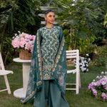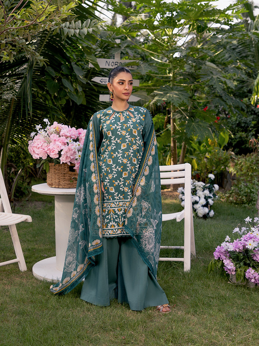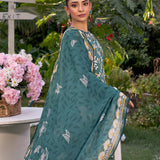 Embrace sophistication with this turquoise 3-piece unstitched suit, featuring intricate front embroidery and a vibrant printed dupatta. A perfect blend of elegance and freshness at an affordable price