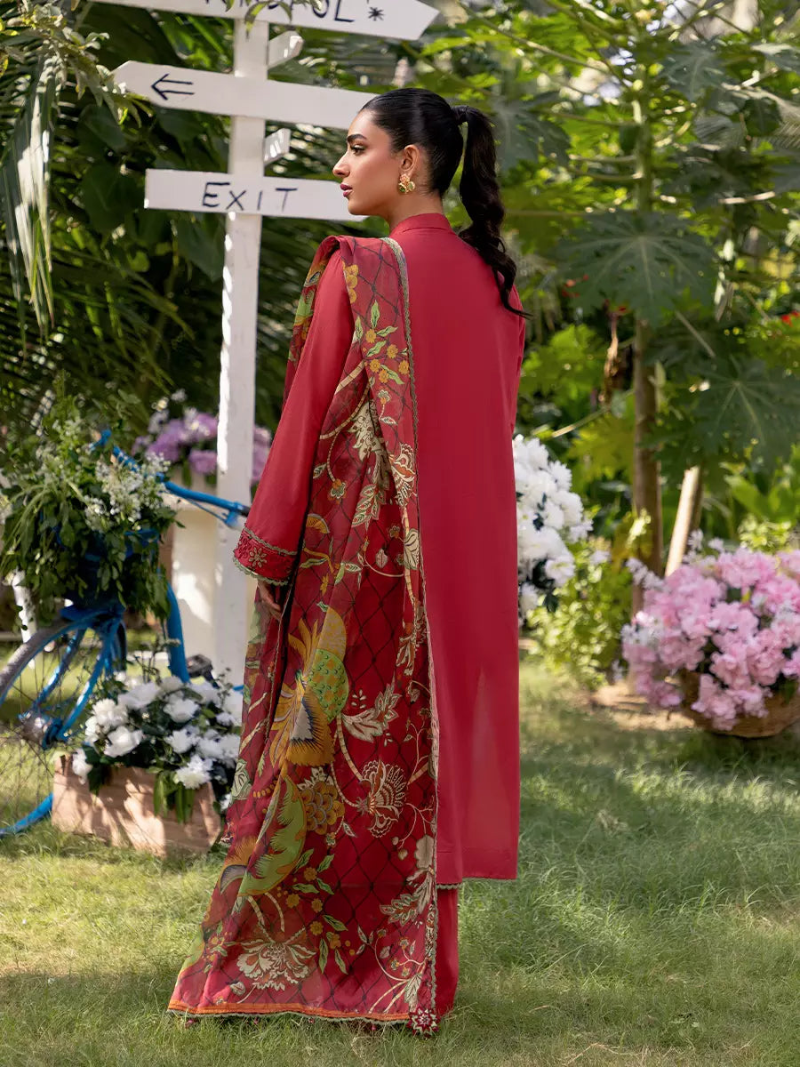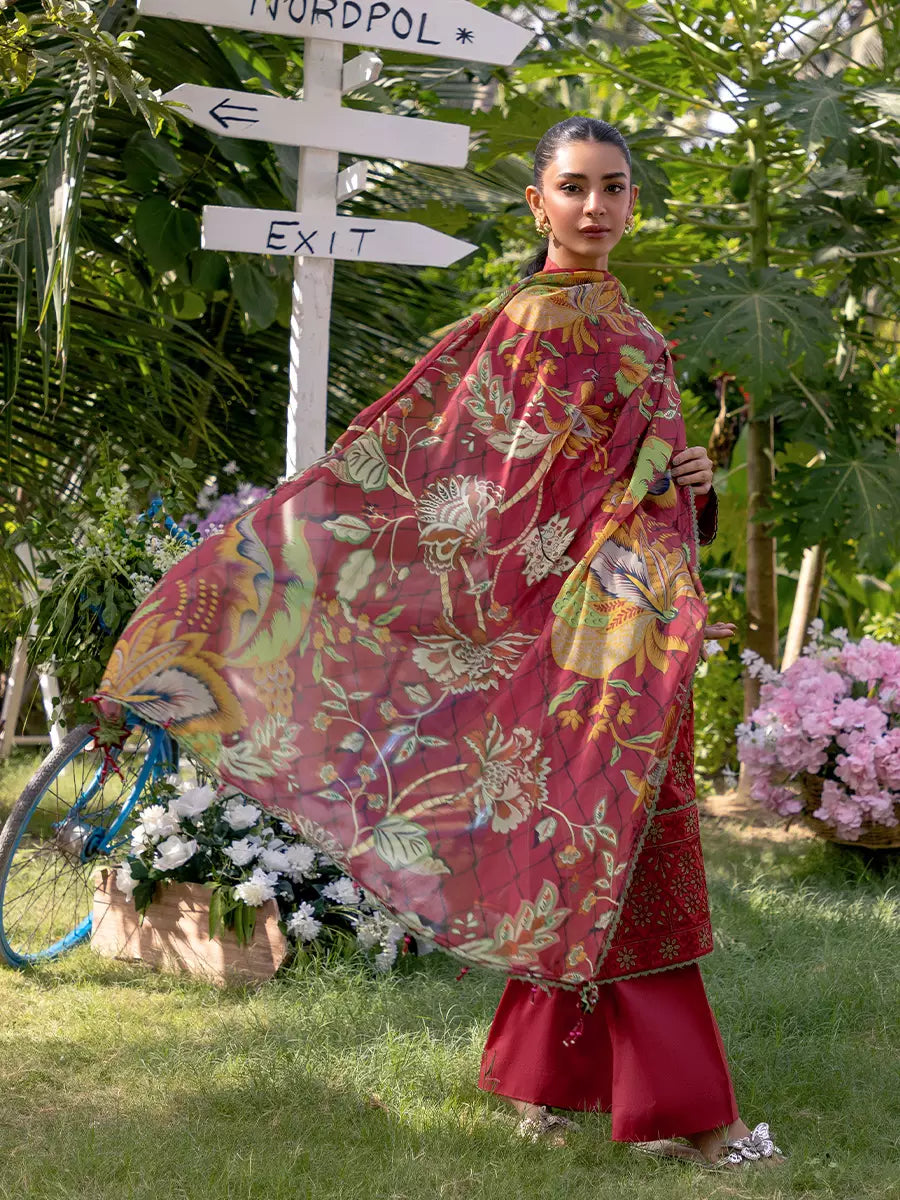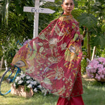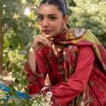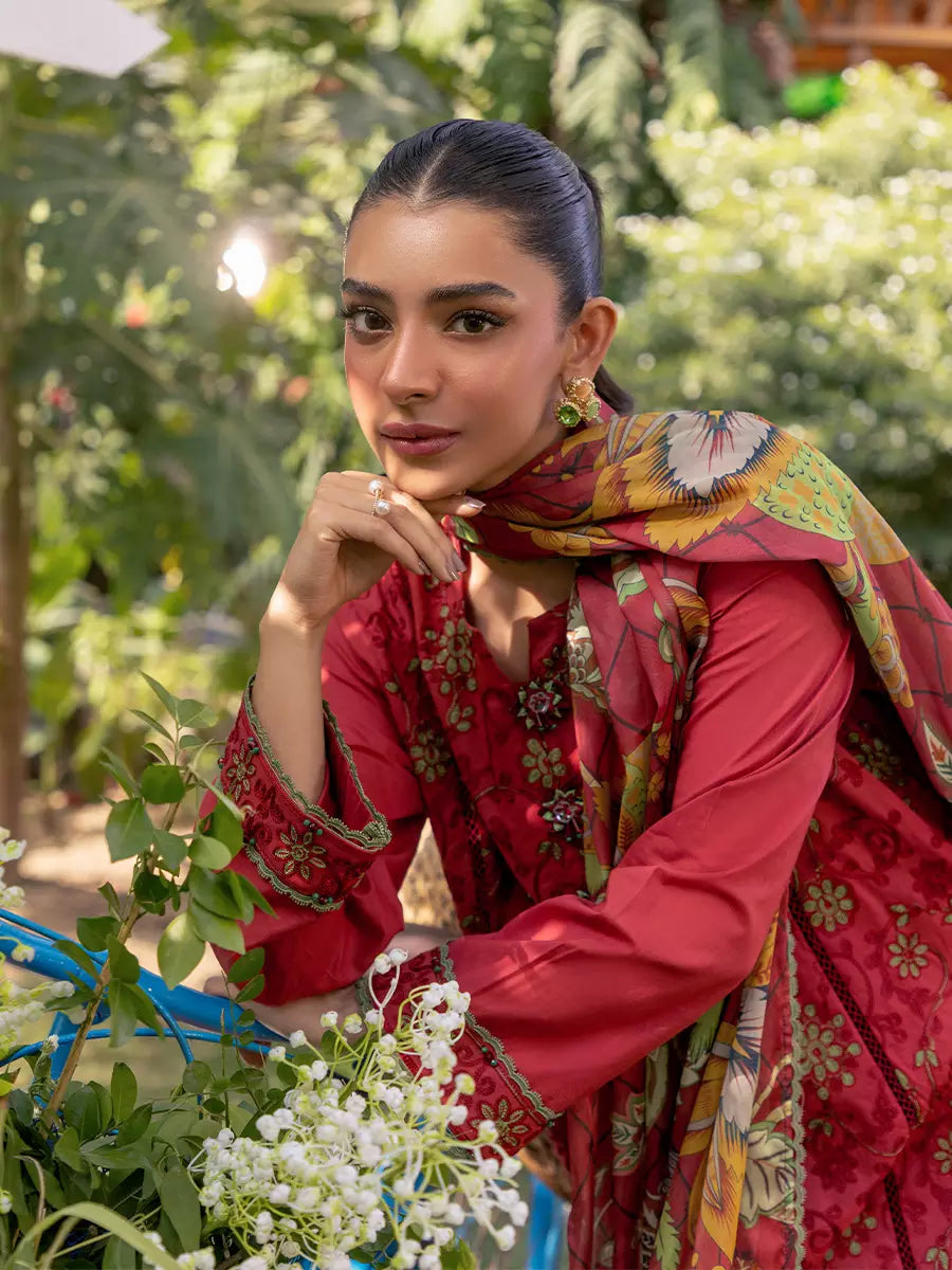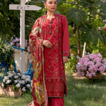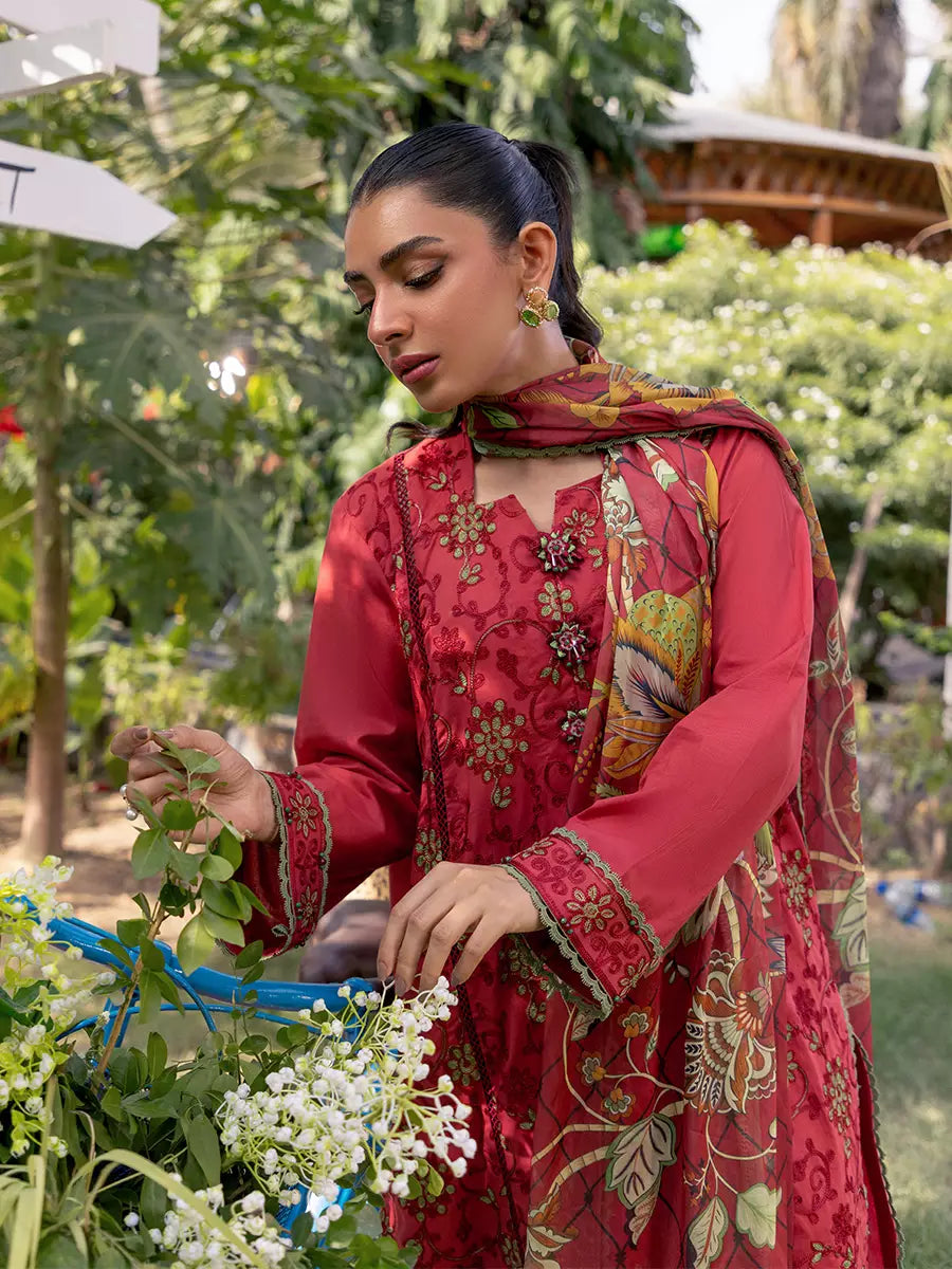 Illuminate your wardrobe with this burnt orange 3-piece unstitched suit, featuring intricate front embroidery and a beautifully printed dupatta. A stunning blend of warmth and elegance at an affordable price