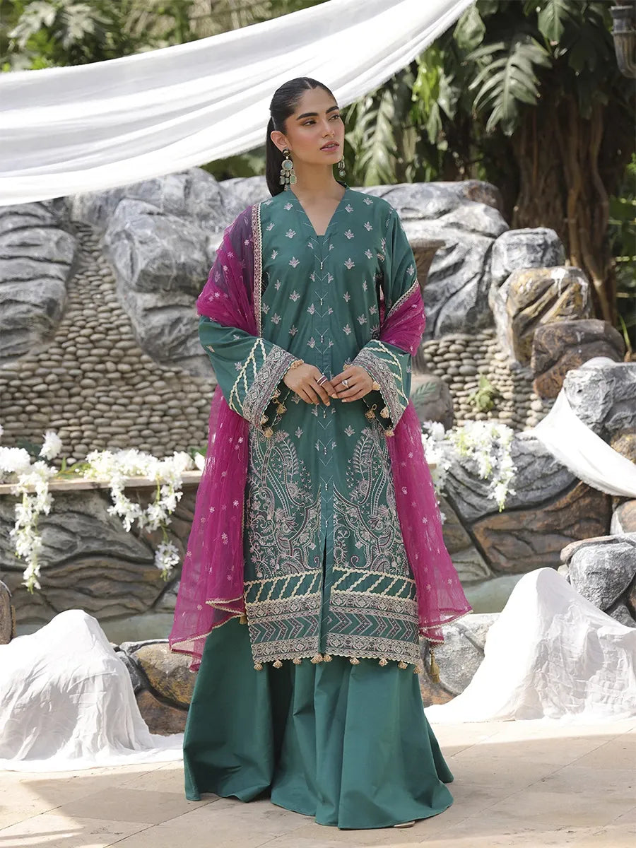 This exquisite 3-piece outfit is the perfect choice for your dawat wear, combining elegance with comfort. The shirt is made from soft, dyed cambric fabric and features stunning embroidery with shiny zari thread work on the front and sleeves, creating a sophisticated and eye-catching design. Paired with a dyed plain cambric trouser, it ensures both style and comfort throughout your day.