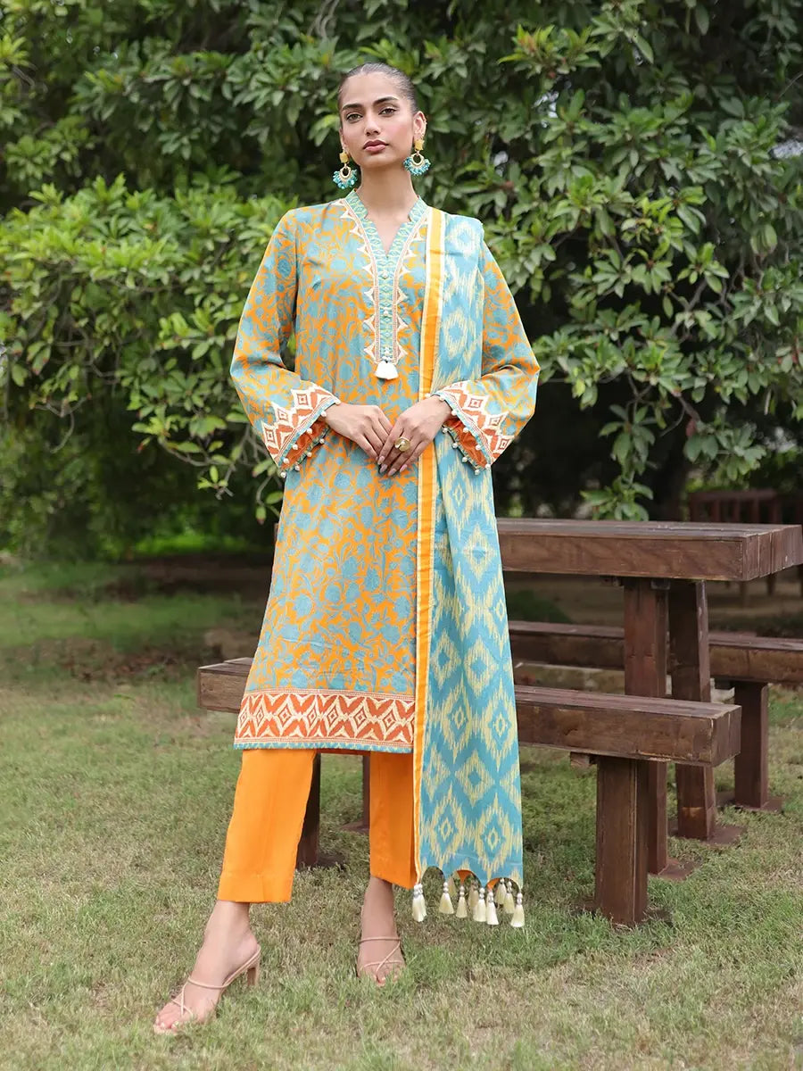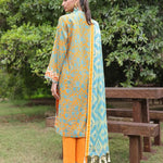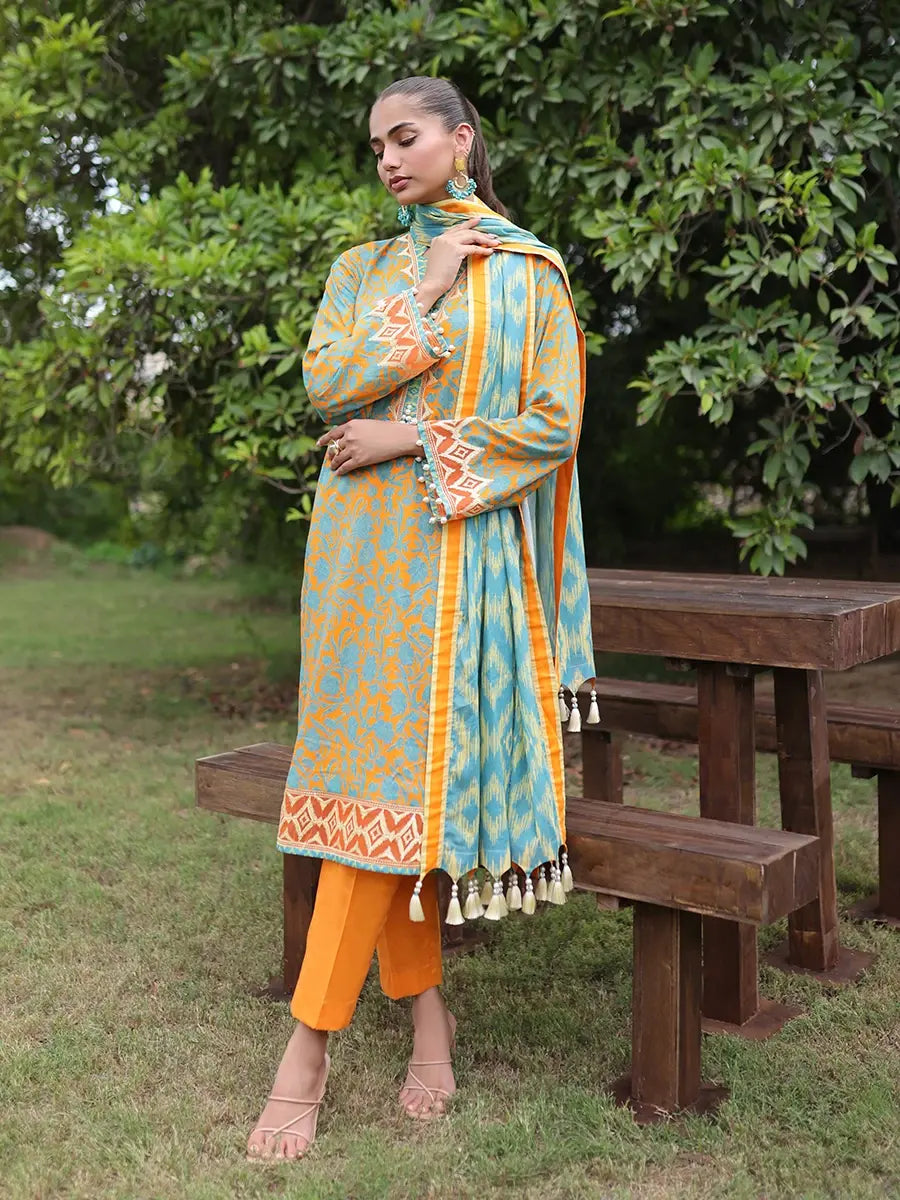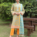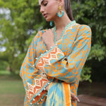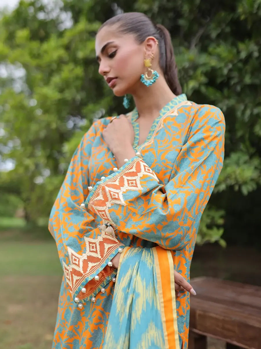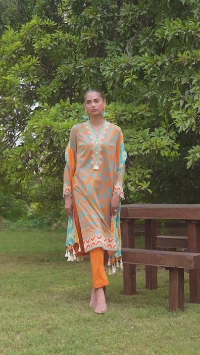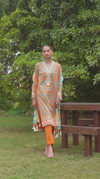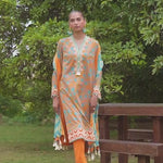 Brighten your look with our vibrant orange 3-piece, showcasing a cambric digital printed dupatta, complemented by a stylish printed shirt and trouser.