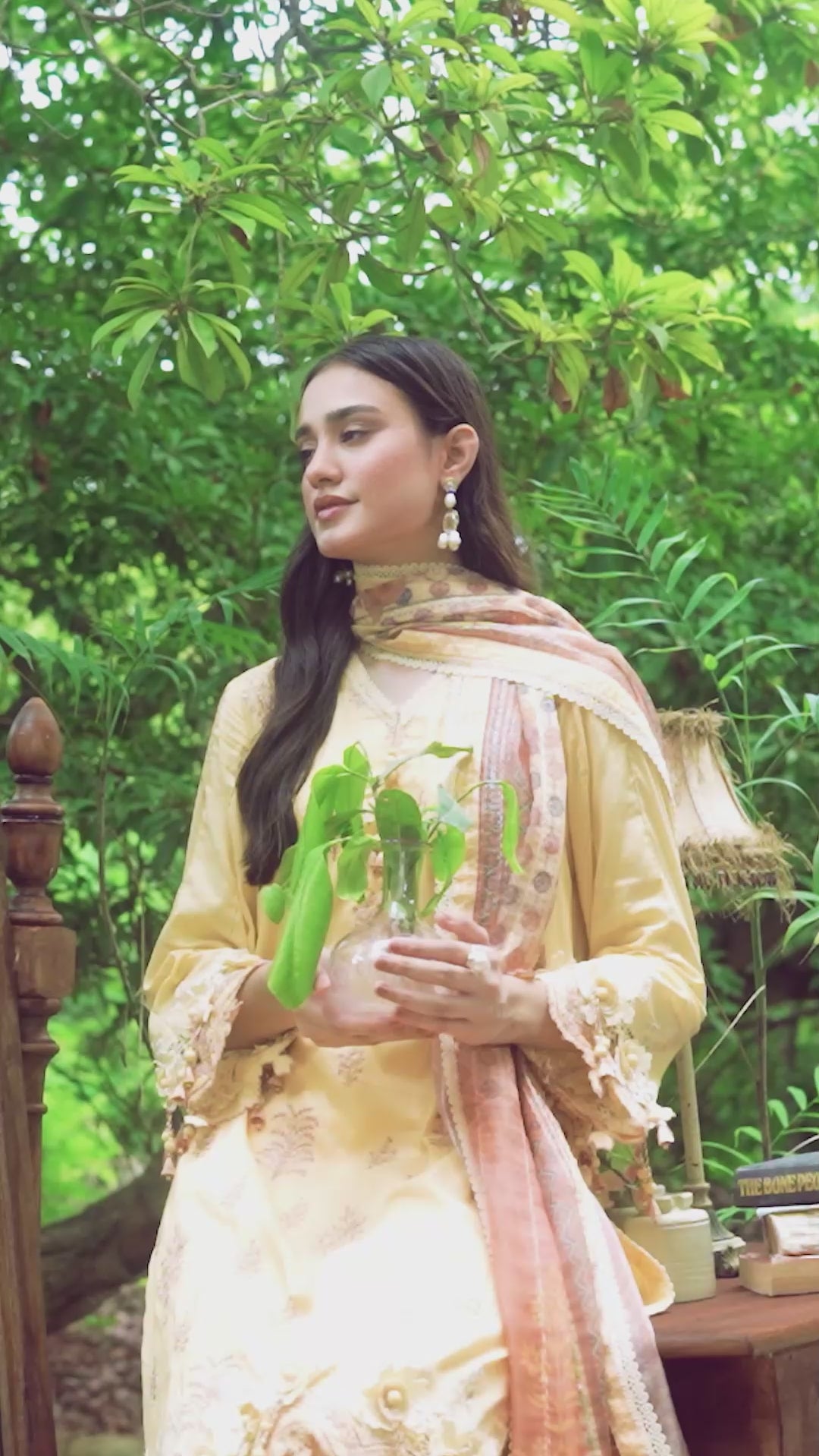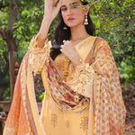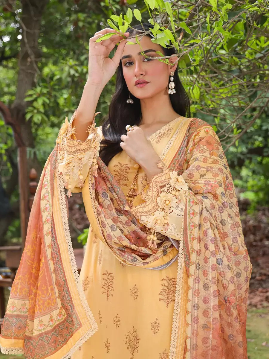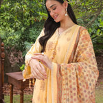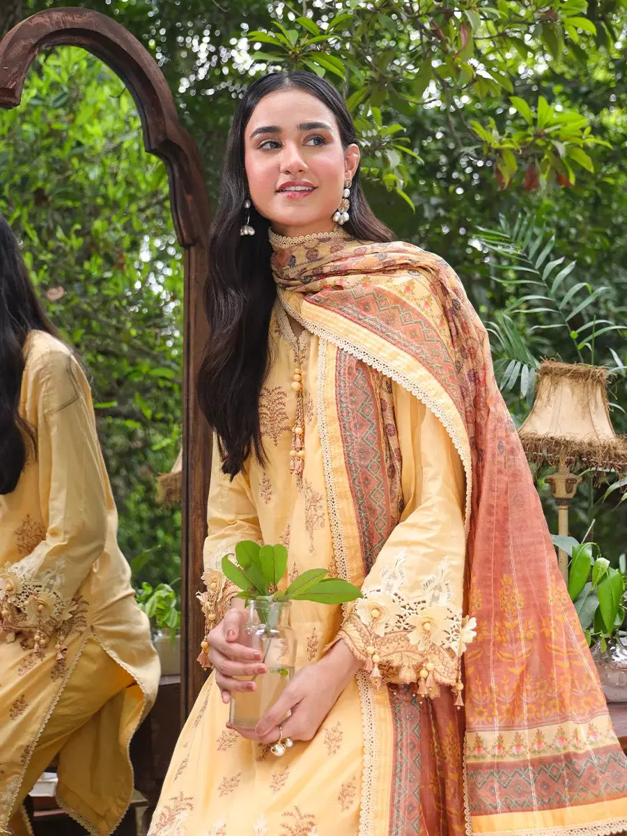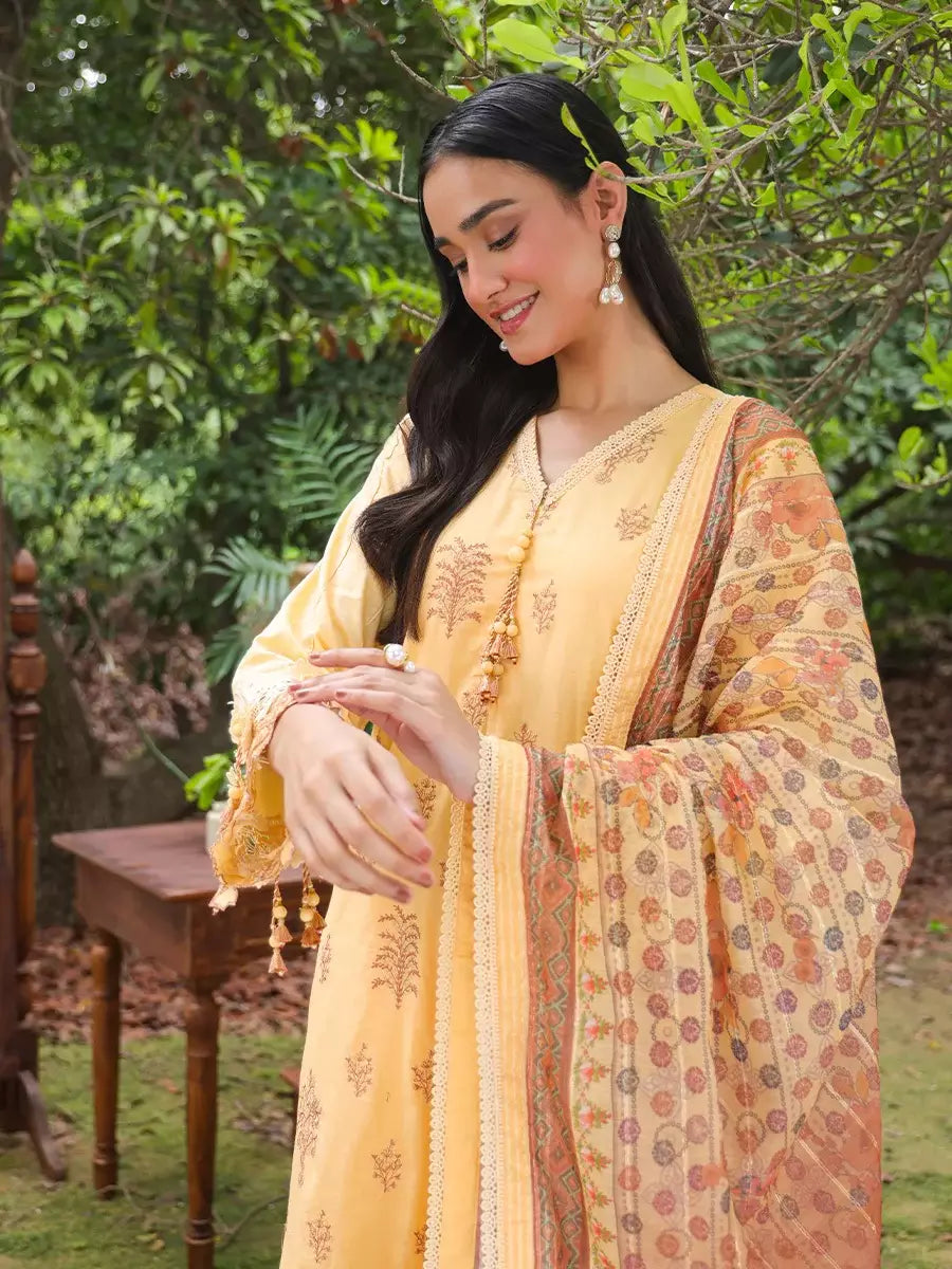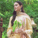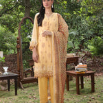 Elegance redefined: A stunning three-piece yellow suit adorned with exquisite printed embroidery